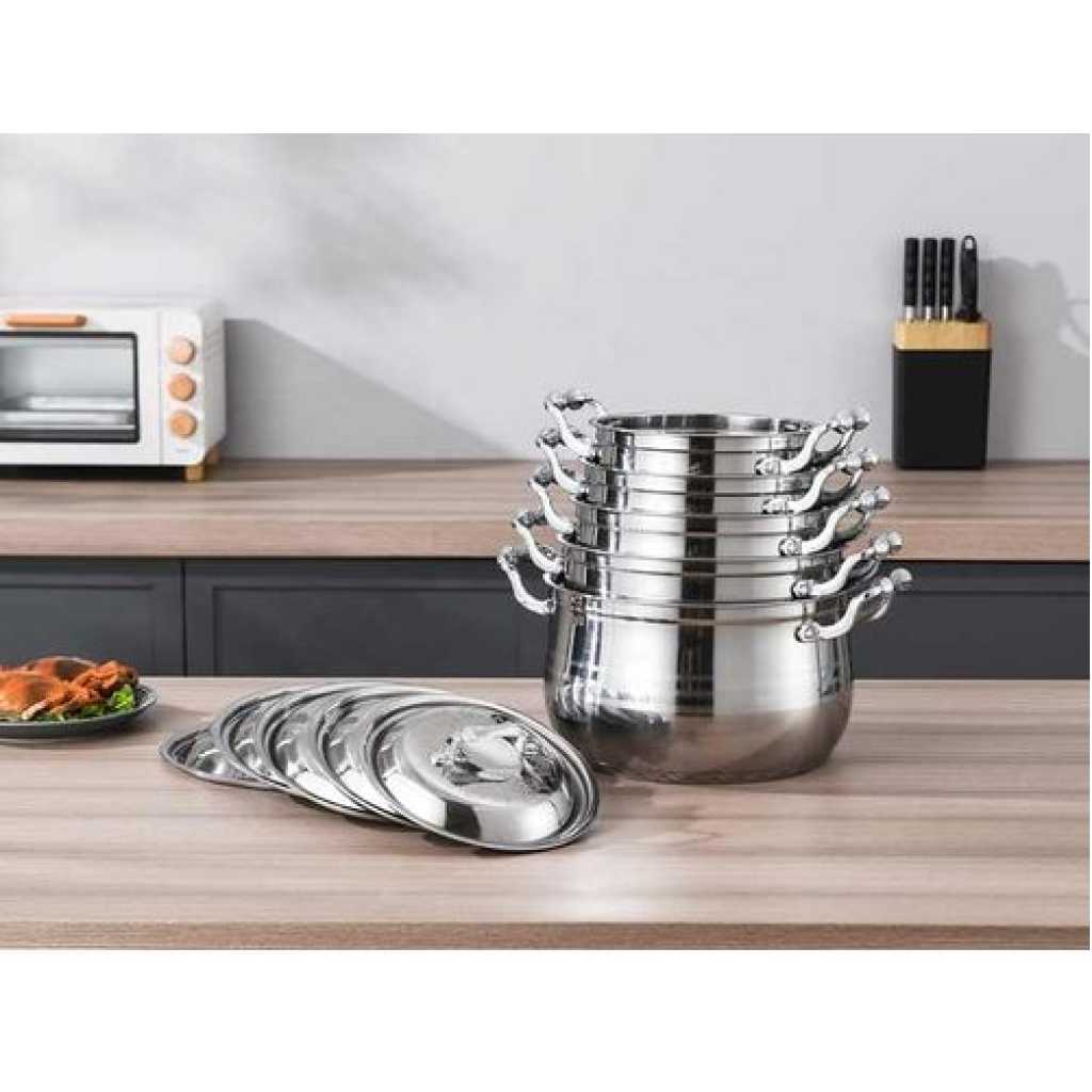 Key Features: 10 PC 22, 24, 26,28,30CM Stainless Steel Saucepans Cooking Pots- Silver. Color: Silver Material: stainless steel. Cover material: heat-resistant glass. Number of items in a set: 10 Bottom type: 5-layer. Measurement scale: yes. Handles fastening method: riveted connection. Handle type: hollow. Lid with a steam outlet: yes. Metal polishing: mirror/satin. Dishwasher safe: yes.