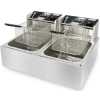 12 – Litres Commercial Double Deep Fryer – Silver This double deep fryer is the best for commercial use in hotels, restaurants, takeaway kiosks and home also . The product is made of a strong stainless steel body that can resist any kind of heat and withstand working for longer hours, it also has a strong heater that is made capable to work for longer hours and also fast heating to save power and time. The fryer comes with two stainless steel oil bowls that helps not to mix up food of different cooking heat percentages, or not to mix spices with non spiced foods, like chicken can be put in one bowl and french fries in another bowl. This also saves time since you cook two different foods at the same time. The fryer has two removable stainless steel colanders which make removing easy, it also has heat control nods on each heater which help in heat regulation, the fryer colanders are all insulated with black handles which keeps the user safe from any accidental burns during frying.