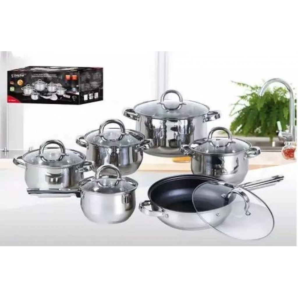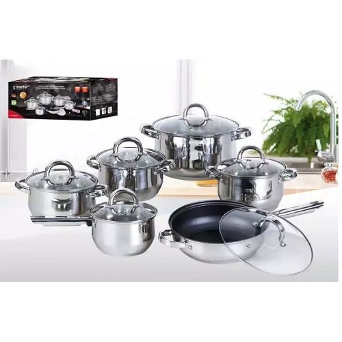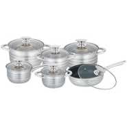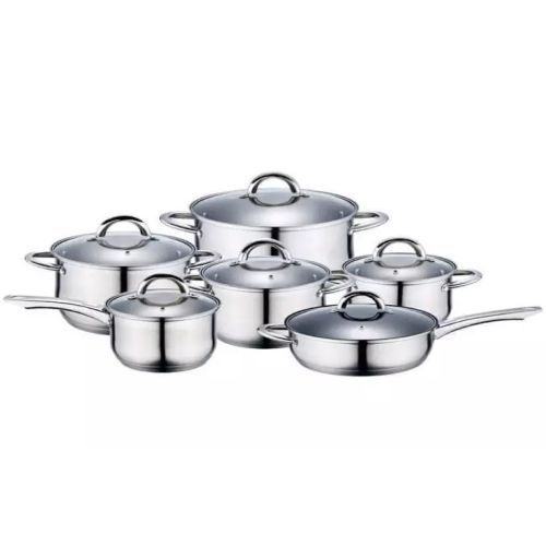 Key Features: Color : Silver Material: stainless steel. Cover material: heat resistant glass. Number of items in a set: 12 Bottom type: 5-layer. Measurement scale: yes. Handles fastening method: riveted connection. Handle type: hollow. Lid with a steam outlet: yes. Metal polishing: mirror / satin. Dishwasher safe: yes. K-gold plate knob and handle
