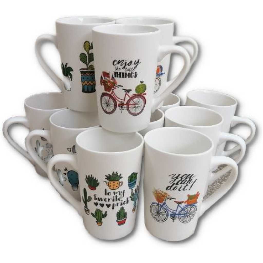 Set of 12 pcs.whiteCeramic mug, perfect for coffee, tea, hot cocoa and more.FDA approved lead and cadmium free,dishwasher and microwave safe Each cup 10 Oz, each size : 3.3″x4.5″x4.1″H(8.5×11.5×10.5CM)Traditional Elegant handle design,safe package is perfect for family and friends.High quality ceramic made,great for daily use. Made in China