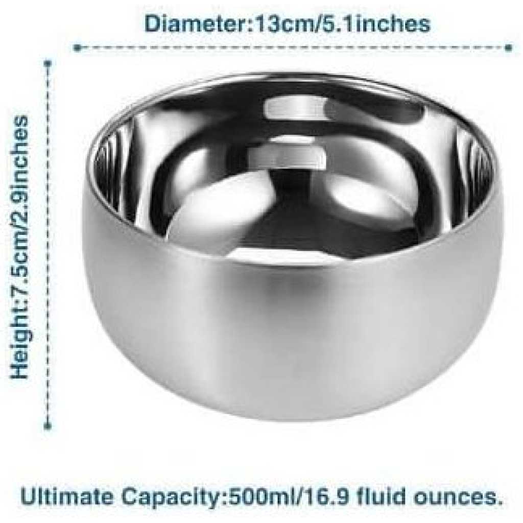 Key Features: (1)Material and surface technology: Stainless steel 316#,the inner side of the bowl is mirror polished,and the outer side is brushed. (2)Structural design: Double wall insulated design protects your hands from cold ice cream or hot soup! (3)Ultimate capacity:500ml/16.9 fluid ounces. (4)Bowl mouth diameter:13cm/5.1inches (5)Bowl height:7.5cm/2.9inches (6)Net weight of a single item:165g/0.36lb (7)Color:Silver (stainless steel primary color)