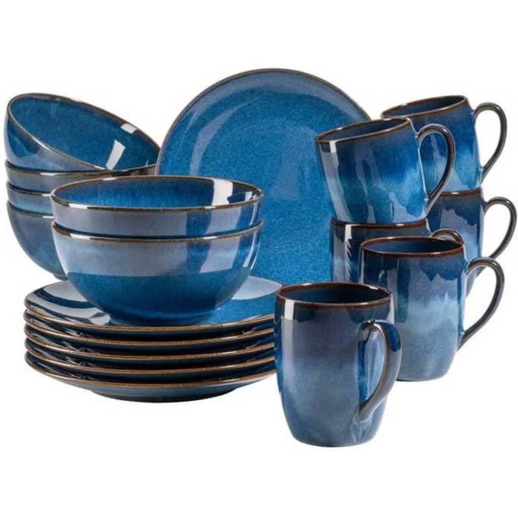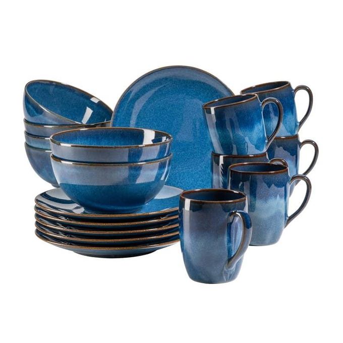 16 Piece Dazzling Blue Plates, Cups, Bowls Side Plate Dinnerware Set – Blue The Simple Lined 16 Piece round Dinner Set is part of the break and chip resistant clay dinnerware, allowing it to stand up to the rigours of everyday life and still look great. Contemporary plain cream inside with shinny black background outside . Sleek round shapes and flared rims fuse perfectly with the traditional rounded inside, resulting in a totally fresh but timeless look. Versatile enough for everyday and entertaining! Features: Simple 16-Pc Set includes 4-each: 4Dinner Plates, 4 Side Plates, 4 Soup/Cereal Bowls, 4 Stoneware Mugs Dishwasher safe for long lasting patterns Microwave and oven use for versatility Patterns won’t wash, wear or scratch off Break and chip resistance for carefree durability Stackability for cupboard space efficiency. Fine clay