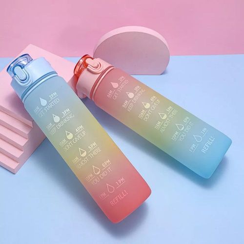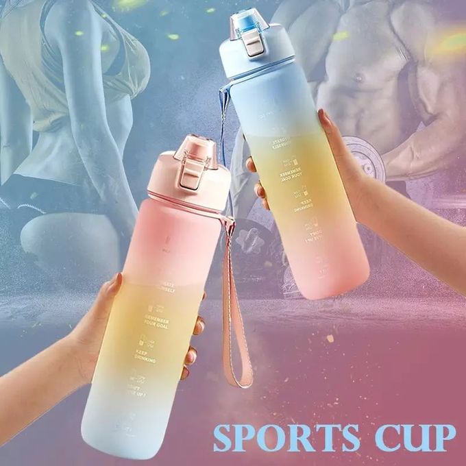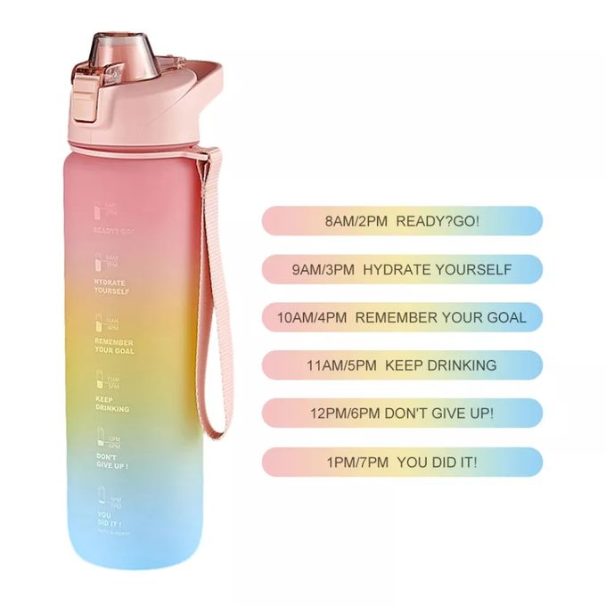 1 L Time Marker Fitness Jug Outdoor Frosted Water Bottle. 1. Drinking water may help to prevent and treat headaches 2. Drinking more water may help relieve constipation and treat kidney stones 3. Water helps prevent hangovers 4. Water helps to maximize physical performance, drinking more water can help with weight loss 5. Hydration has a major effect on energy levels and brain function, drink more water make your work or sports more efficient Do you often forget or even get tired of drinking water? Choose our motivational water bottle, it will make it easier for you to keep hydrated. MOTIVATIONAL DESIGN Large Capacity: 64oz water is equivalent to 8 cups of water recommended by scientists for humans every day, no more need to refill it frequently Motivational Quote Design: Reminding you stay hydrated and drink enough water throughout the day Time & Capacity Markers: Great for measuring your daily intake of water, it’s nice visually seeing you get closer to your goal and makes you want to reach it sooner HIGH QUALITY & HUMANIZED DESIGH Food Grade Material: Big water bottle made of durable Tritan material, which is 100% BPA FREE, no chemical taste Leakproof: Upgraded food grade silicone O-ring prevent 100% leaks Dust-proof: The spring-loaded dust cap design can prevent dust from entering to your bottle Secure lock: Has one push easy lock/unlock Large Mouth: With a large mouth, this water bottle can easy to fit ice cubes and fruits Two ways to Drink: 2 liter water bottle designed with a removable straw, you can take a swig of water through the mouth or sip upright through the straw Convenient to Carry: Portable water bottle with plastic handle is lightweight, can be easily carried to gym sports, etc