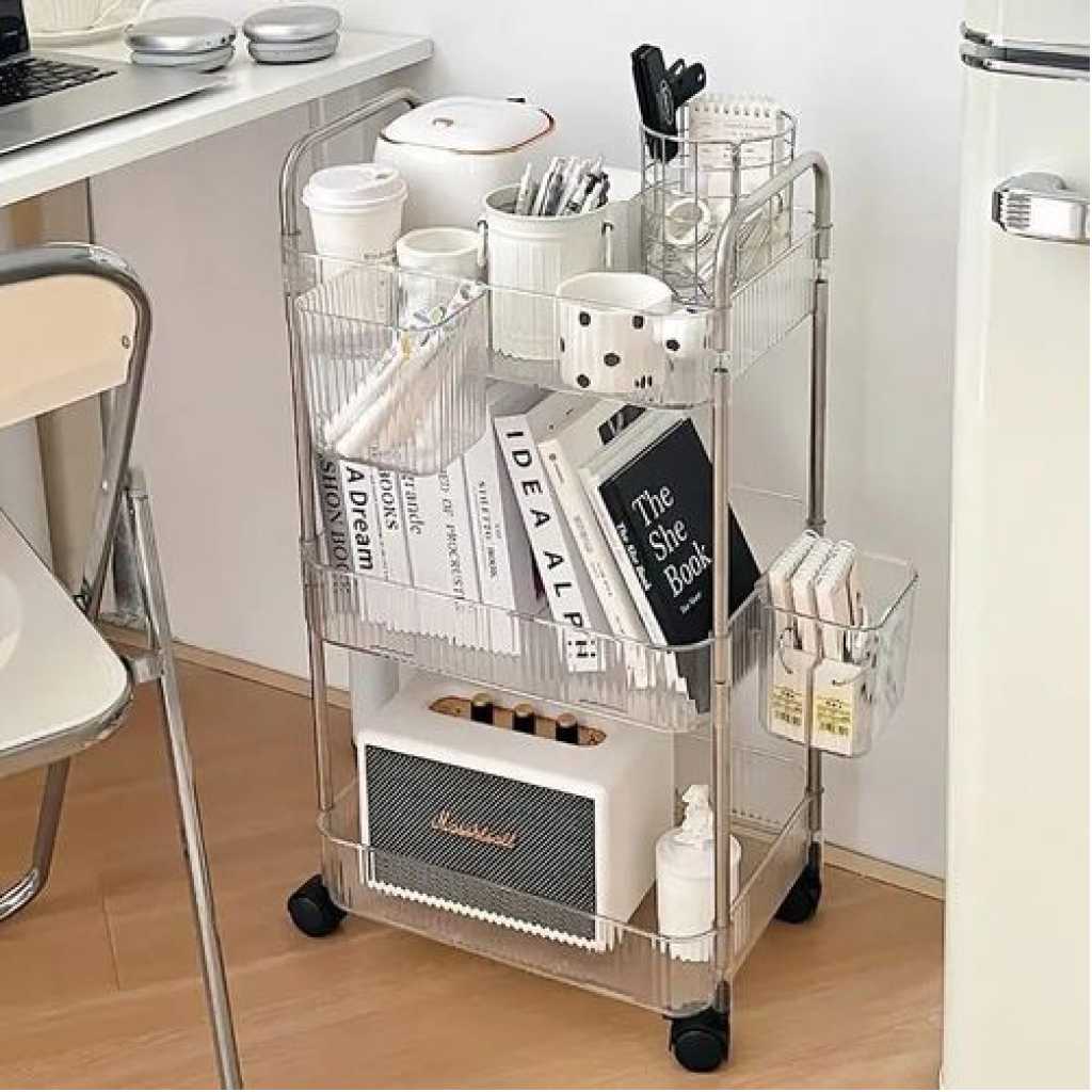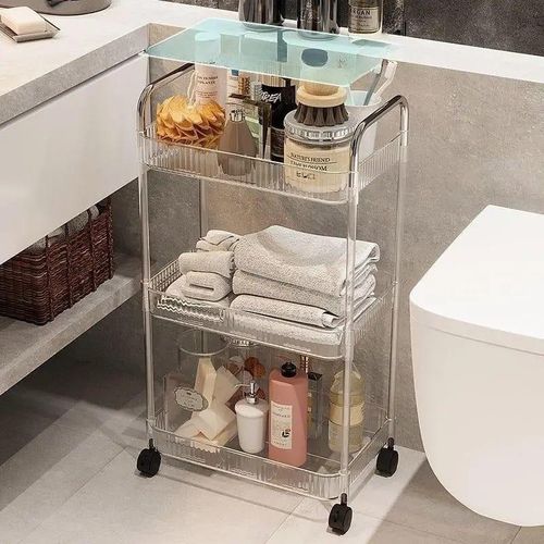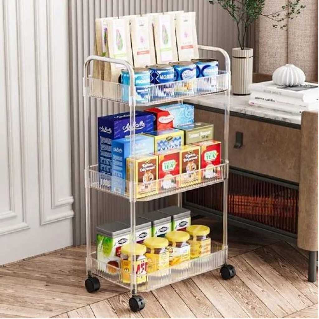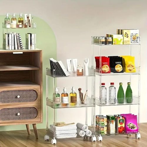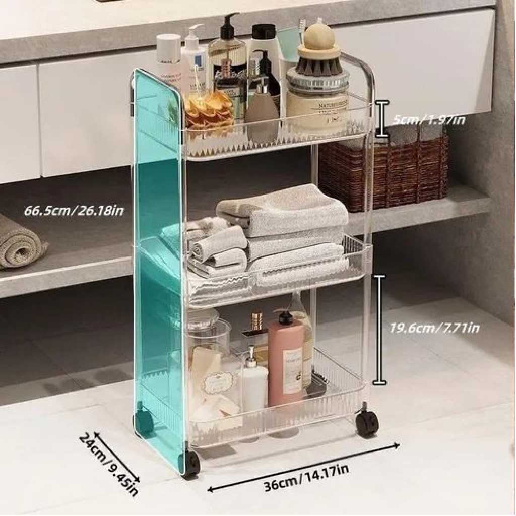 Key Features: 1pc Acrylic Clear 3 Tier Utility Cart, Rolling Cosmetics Laundry Organization Trolley Cart With Handle And Wheels, Multifunctional Storage Shelves Side Table For Kitchen Living Room Office Assembled Dimensions: 22”x 7.8”x 30”(H).inch Material: Made of durable and high transparency ACRYLIC, very sturdy, elegant, and easy to clean. Small Space Solution: Acrylic Narrow Rolling Beverage Shelves or Trolley All-purpose used acrylic storage shelf. Best Choice for your Bathroom, Kitchen, Dining room, Bar, and Living room for Storage purposes. Neatly displayed and easy to locate. Easy to Assemble and Light Weight for Effortless Portability.