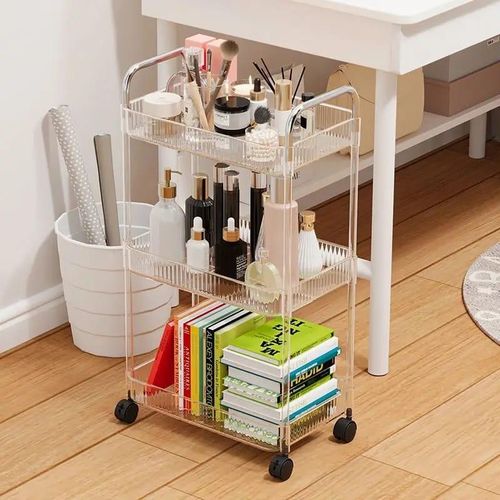 1pc Acrylic Clear 3 Tier Utility Cart, Rolling Cosmetics Laundry Organization Trolley Cart With Handle And Wheels, Multifunctional Storage Shelves Side Table For Kitchen Living Room Office This rolling serving cart, with a simple and stylish design, is effortlessly integrated into any home decoration. the 3-tier tray design provides enough space to store crafts, towels, photo frames, snacks, drinks, toiletries, plants, and more. Designed for space-saving and easy transport, it’s a nice addition to every home and office! Feature: The elegant look is well coordinated with any room style Sturdy construction adds its stability and durability 3 tier metal storage cart provide ample space Made of clear acrylic material that is smooth and durable Equipped with four 360-degree rotating wheels for easy scrolling Easy assemble with clear instruction Bring it home! It will be a perfect addition to decorate your home. 【Stylish Acrylic Cart】– This multifunctional utility cart is a practical solution for adding storage space to your home. the elegant shape adds a more modern and fashionable atmosphere to your home. At the same time, the transparent acrylic plate is very easy to clean. 【Ample Storage Space】– The mobile bar cart is designed with 3-tiers of shelves to fully hold your fruits, drinks, snacks, wine utensils, kitchen supplies, or the items you need to display. It can be used as a wine rack, kitchen rack, or dining car, etc. 【Acrylic Bar Cart】– This bar cart for the home is crafted with thickened acrylic material, so it is strong enough to be used for a long time. clear acrylic lends this modern serving cart a versatile look, that will easily fit in with your existing home design. 【Multiple Use Serving Cart】– This acrylic bar cart combines elegant appearance and contemporary aesthetics, which can be used as a serving cart, for serving tea or whiskey tastings. It is ideal for living rooms, bedrooms, kitchens, hotels, cafes, and other commercial uses. 【Easy to Install & Move】– This rolling cart supplies detailed instructions, it is easy to assemble, which will save both your time and energy. you will assemble the bar carts for the home easily! 4 swiveling wheels at the bottom to roll the wine cart from one space to another conveniently and easily.