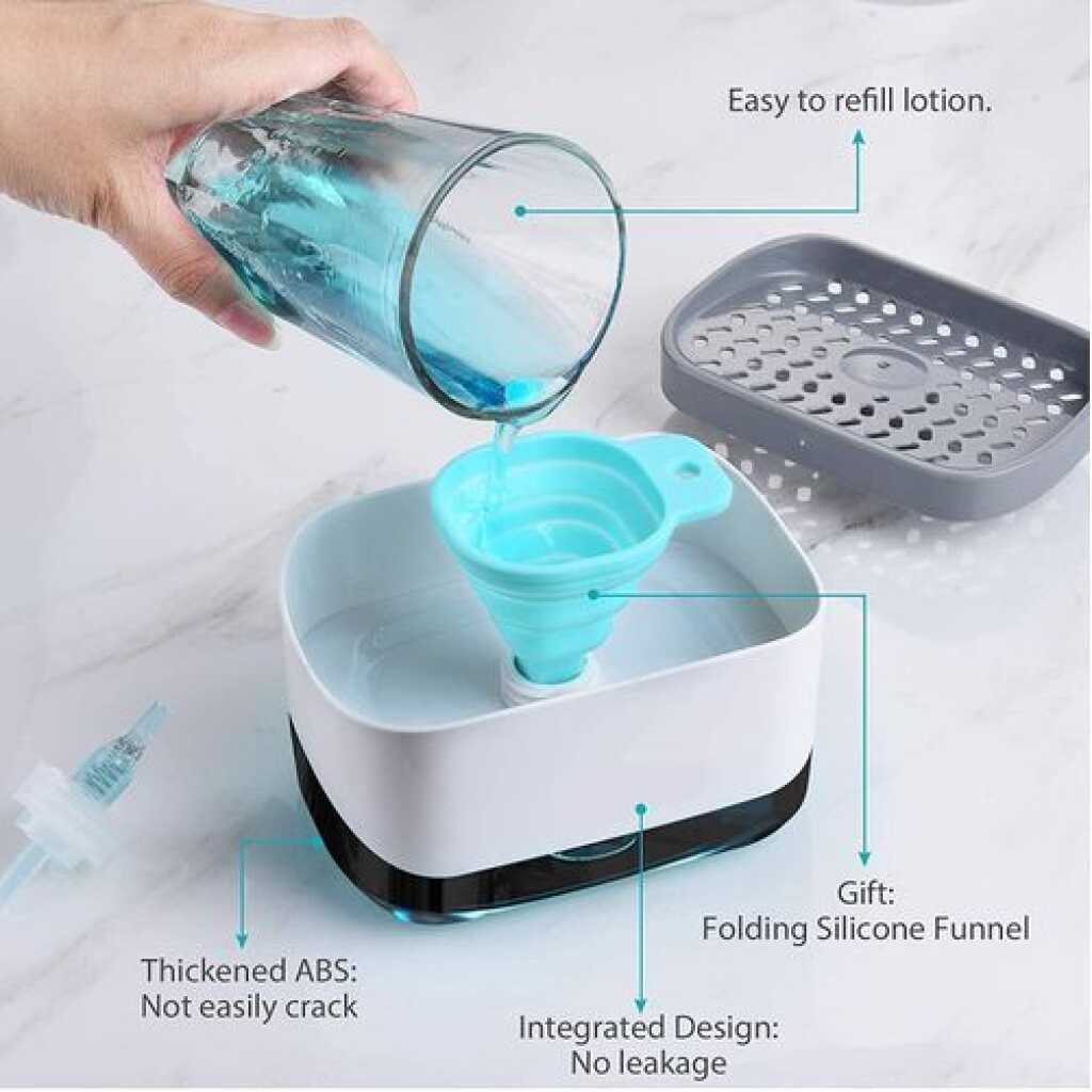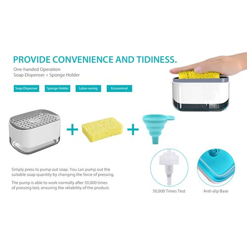 Key Features: 2-in-1 Countertop Dish Washing Liquid Soap Dispenser Pump With Sponge Holder Hand Sink Caddy Organiser Tidy. Innovative Design & Large Capacity – Unlike other traditional dispensers, this soap dispenser is designed to be superior, made of unbreakable ABS plastic making it long-lasting. *We have updated the sponge to improve the customer experience, the received will be slightly different from the picture. Instant 2 In 1 Dish Soap Dispenser – Sink dispenser with attached caddy holds sponges, scrubbers, rags, and scouring pads in one convenient place while keeping water off of kitchen counters. NO Messy Spills, Dripping, or Trailing. Save Your Money, Space, and Time – Our Soap Pump Dispenser is able to contain 250mL detergent. And owing to the special pump design, the dispenser can help you make full use of the detergent without wasting it. The instant operation will save your Time and 1 hand operation will save your energy Practical Combination – Combine the Soap Pump Dispenser and sponge holder, not only achieving a space-saving effect but also preventing water accumulation on the kitchen counter, thus making your kitchen neat and tidy. Besides, crafted with thickened ABS, which is sturdy, durable, safe, and BPA-free. Anti-Base & Sponge & Funnel – This Dish Soap Dispenser is equipped with an anti-slip strip on the bottom, making it more secure and stable on the counter without easily sliding. Apart from the Soap Dispenser, the package also includes 1 sponge scouring pad and 1 foldable silicone funnel.