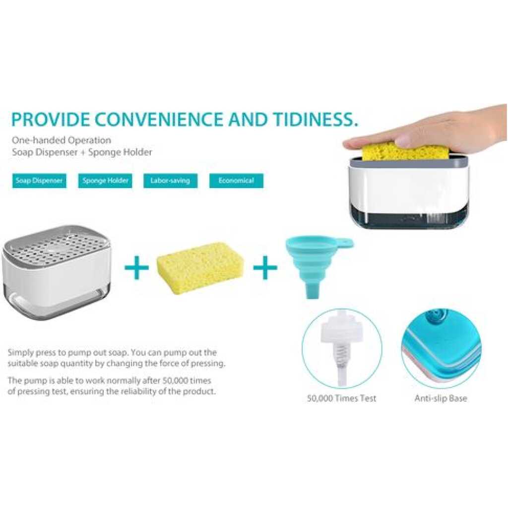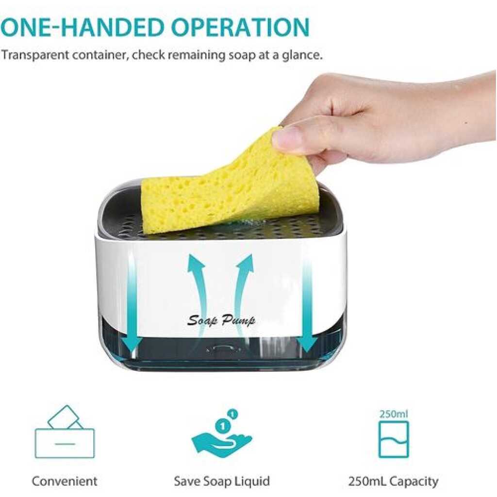 2-in-1 Countertop Dish Washing Liquid Soap Dispenser Pump With Sponge Holder Hand Sink Caddy Organiser Tidy. Cleaning dishes is about to get a whole lot faster with this Soap Pump & Sponge Caddy. Fill it up with 13oz of your favorite dish soap, then use the included sponge to press down on the pump, which dispenses the perfect amount of dish soap up onto the sponge. When you need more, just pump again for another shot of soap. No more stopping to grab the soap bottle. Any other sponge or scrubber will work with it too! INNOVATIVE DESIGN, HIGH QUALITY, LONG LASTING & RUSTPROOF Finally! Unlike other traditional dispensers, this 2-in-1dishwasher soap dispenser is designed to be superior, made of unbreakable ABS plastic making it long-lasting. INSTANT 2-IN1 DISPENSER + Caddy, 1 HAND OPERATION, COMPACT ORGANIZATION: Sink dispenser with attached caddy holds sponges, scrubbers, rags, and scouring pads in one convenient place while keeping water off of kitchen counters. PRECISE, EFFORTLESS DISPENSING & LARGE CAPACITY: Dispense the perfect amount of soap onto the sponge, extremely easy to use. The container has a large capacity of 13 ounces so you don’t need to refill it frequently. Works with all kinds of liquid soaps. VERSATILE USE – Best for home, school, office, hospital, hotel, restaurant, factories, airport, gas station, and so on. Ideal for commercial and public Places. SAVE MONEY, SPACE, and TIME! This dishwashing dispenser will totally transform your kitchen life, designed to wash dishes FASTER, the instant operation will save you time and 1 hand operation will keep your ENERGY level always high. Choosing the Soap Dispenser Makes your kitchen Tidy! With this dish soap dispenser and sponge holder, the cleaning of dishes will not be cumbersome. Fill it with 8.5 ounces of your favorite dish soap, and then use the attached sponge to press the pump to dispense the perfect amount of dish soap on the sponge. When you need more, just pump out some more soap again. No longer need to stop to get a soap bottle. Any other sponge or scrubber can also work with it! Specifications: Material: ABS Size: about 5.1X3.35X3.5 Inches