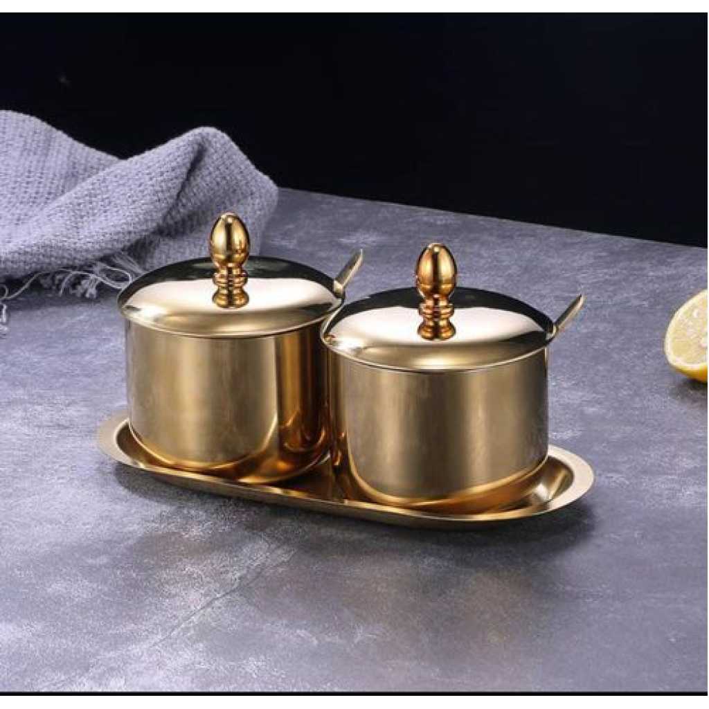 Key Features: 2 Pc Seasoning Containers Spice Jar Rack Condiment Salt Pepper Sugar Storage Organizers With Serving Spoons – Gold. Made of food-grade stainless steel Non-toxic and durable to use. Three condiment jars are included All parts are rounded smooth, avoiding hurting your hands. With a stainless steel jar holder, easy to detach and refill seasonings. Smooth surface, easy and convenient to clean.