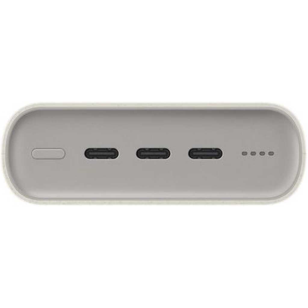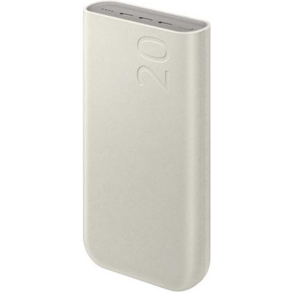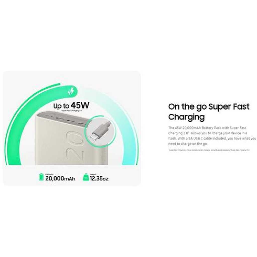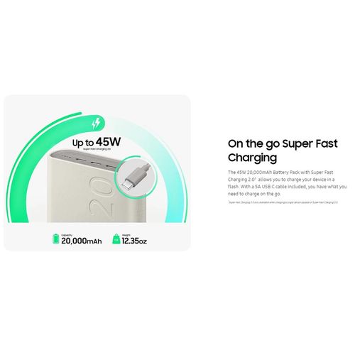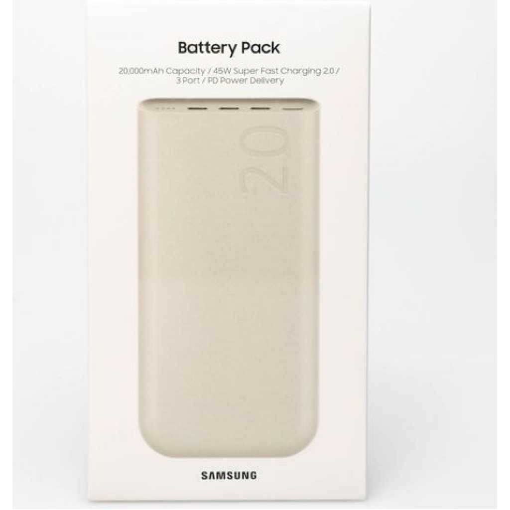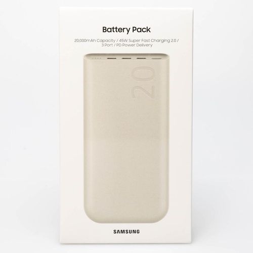 Key Features: This image displays a Samsung 20,000mAh Battery Pack (Power Bank). Capacity: 20,000 mAh Charging: 45W Super Fast Charging 2.0 with PD (Power Delivery) 3.0 PPS support Ports: Features three USB Type-C ports for charging up to three devices simultaneously Compatibility: Supports Super Fast Charging for various Samsung Galaxy phones and tablets