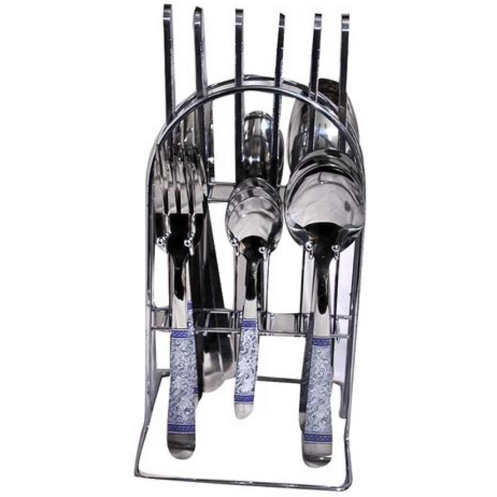 24 Piece Flowered Dinner Cutlery (Forks, Spoons & Knives) With A Stand – Silver. A set of stainless steel cutlery suitable for a fine dining experience. The full set includes 6 forks, 6 teaspoons, 6 tablespoons, and a stand.