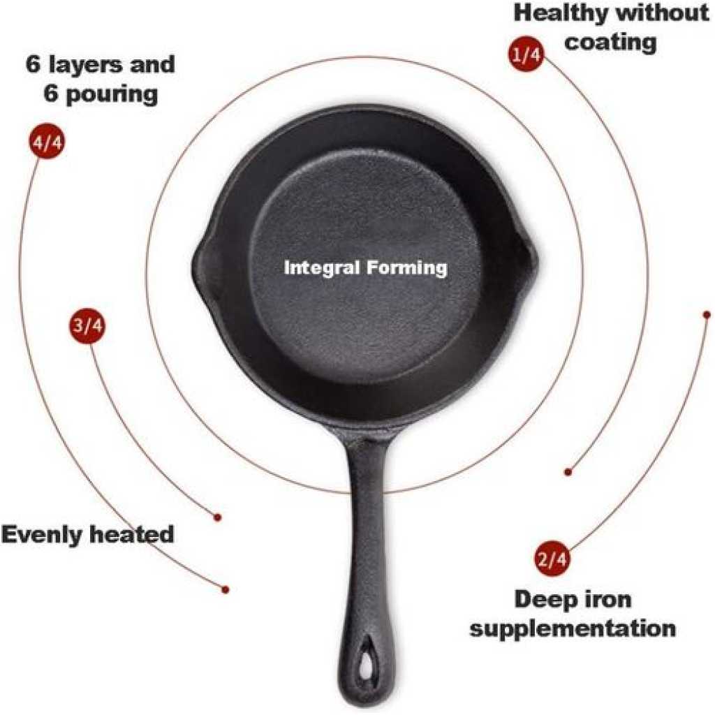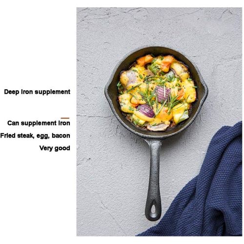 Product description Material: cast iron Type of lid: no lid Packing volume: 35*20*8 USE 1) It is safe to use metal, wood or silicone utensils with your cookware. 2) Some foods (especially eggs) may stick to some degree during initial usage. It is advisable to employ extra oil or butter until the seasoning has built-up. 3) Acidic foods such as tomatoes, beans and certain sauces can damage the seasoning and should be avoided until the natural non-stick layer has matured. 4) Cast iron rarely needs to be placed on an above-medium heat setting if adequately pre-heated. On occasions when a higher cooking temperature is required, elevate the heat gradually and apply oil just prior to adding the food in order to prevent sticking. 5) Holders/mitts are essential when using the handles. Protect countertops with trivets. Cast iron provides the finest heat distribution and retention of any cookware metal. The heat spreads rapidly and evenly across both the bottom and sides of the material and stays hot for a prolonged period of time. It is also extremely versatile and can be used to sear, fry, sauté, grill, roast, bake, braise and boil – both indoors or out. Cast iron will tolerate any heat source (except microwaves) and is therefore suitable for induction, ceramic, electric and gas cooktops. It will perform effortlessly in the oven, on the stove, in the grill and even on barbecues/campfires.