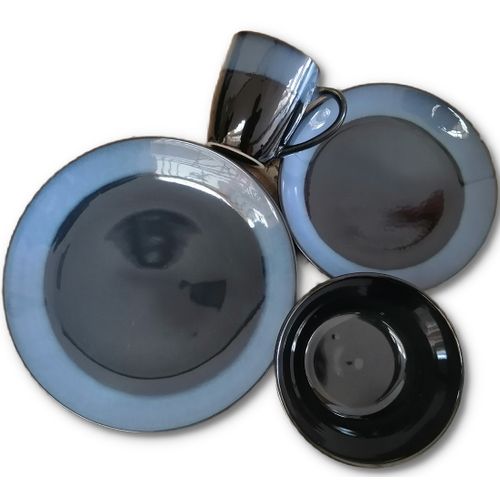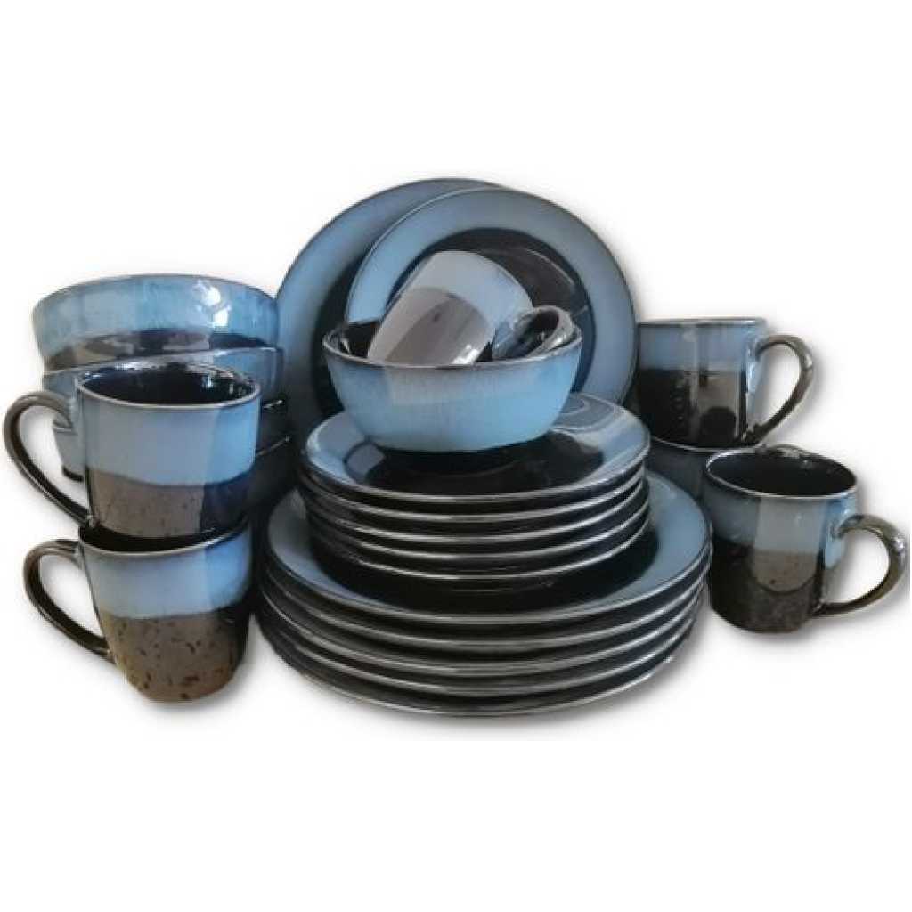 The Simple Blue rim 24 Piece Round Dinner Set is part of the break and chip resistant clay dinnerware, allowing it to stand up to the rigours of everyday life and still look great. Contemporary pattern with sweeping brown lines against a cream background. Sleek round shapes with rounded corners and flared rims fuse perfectly with the traditional rounded inside, resulting in a totally fresh but timeless look. Versatile enough for everyday and entertaining!