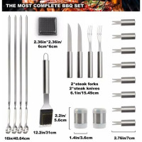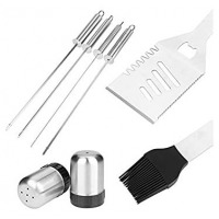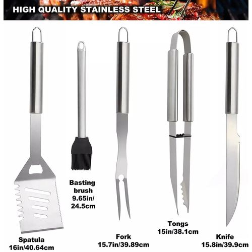 Key Features: PREMIUM QUALITY – The grilling tools are made of professional grade stainless steel, making this barbecue tool set durable and long-lasting, easy to clean and dishwasher safe. – USER-FRIENDLY DESIGN – Elongated and heat resistant handles keep your hands safe from the heat. Hanging rings design enable easy storage during the off-use. All grill utensil sets are stored in portable and convenient case. -ALUMINUM STORAGE CASE – Keep all barbecue utensils stays in order and protected in the lightweight case when you storage or you go. Also it will be an excellent choice for gift set. The high quality grill utensils set kit is an ideal choice for the groomsmen, foodies, barbecue fans, cooks, camping lovers. Specifications: Material: Stainless Steel Color: Silver Size: Slotted Spatula Length: 40.7cm /16.02″(appr.) Cutlery(long) Length: 41cm /16.14″(appr.) BBQ Clip Length: 41.5cm /16.34″(appr.) Grill Brush Length: 40cm /15.75″(appr.) Grill Cleaning Brush Length: 39.2cm /15.43″(appr.) Fork(long) Length: 42cm /16.54″(appr.) Skewers Tool Length: 40.7cm /16.02″(appr.) Cutlery(short) Length: 24cm /9.45″(appr.) Fork(short) Length: 23.2cm /9.13″(appr.) Spice Jar Size: (Dia.)X(H) 3.8×6.2cm /1.50″x2.44″(appr.) Corn Holders Size: (Dia.)X(H) 1.9×6.4cm /0.75″x2.52″(appr.) 26Pcs Storage Case Size: (L)X(W)X(H) 43x27x7cm /16.93″x10.63″x2.76″(appr.) 5Pcs Storage Case Size: (L)X(W)X(H) 37x13x7cm /14.57″x5.12″x2.76″(appr.) Package Included: 26 Pcs 1 x Slotted Spatula 1 x BBQ Clip 5 x Fork 5 x Cutlery 4 x Skewers Tool 1 x Grill Brush 1 x Grill Cleaning Brush 6 x Corn Holders 2 x Spice Jar 1 x Storage Case (not included other decorations) 5Pcs 1 x BBQ Shovel 1 x BBQ Clip 1 x Fork 1 x Cutlery 1 x Grill Brush 1 x Storage Case (not included other decorations)