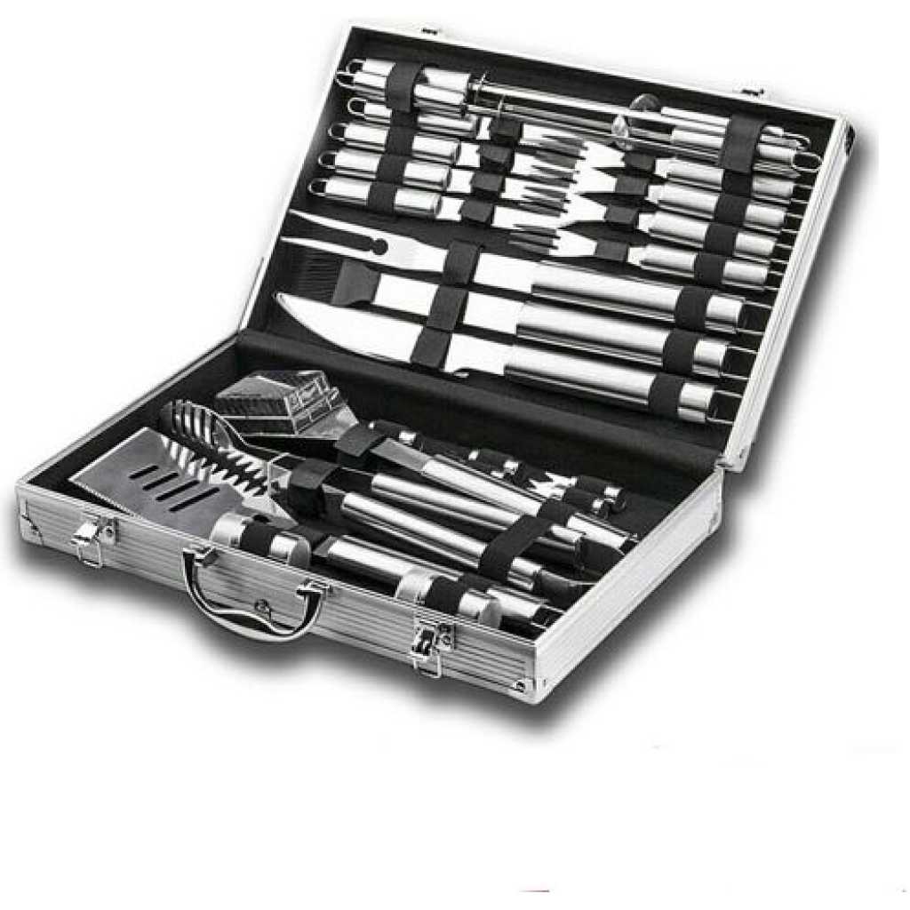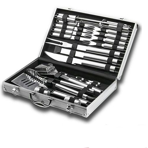 A Perfectly Cooked Meal Requires a Perfect Barbecue Grilling Tools Set. Everything You Need In One BBQ Accessories Set Start grilling with 26pcs complete BBQ tool set to meet all your BBQ needs, you will not bother anymore to choose the grilling utensils. Complete with durable barbecue utensils such as 4-in-1 spatula, tongs, skewers, grill brush and more, each grill accessory has been chosen with a purpose to complement your dishes and make grilling more easier. Professional Safety Quality For Years Of Use Every barbecue tool needed to make the tasty recipe is included in this exclusive grill kit. Each of the accessory is made from high quality grade stainless steel which will not breaking over time. The BBQ tools come with an ergonomic design handle and hanging hook to leave you the wonderful barbecue experience. Enjoy An Impeccable Grilling Time Together Whether you need to get dinner for your family this week or are planning your next get-together with friends, the comprehensive barbecue utensil kit has everything you need to rustle up your favourite recipes. There’s nothing more fun than sharing a special moment together during Holidays, Thanksgiving or Anniversary Celebration with red wine and meats. Share the Perfect Grill Gift and Make a Very Perfect Moment The giving and receiving of gifts with someone you love is a special way to show how much we care for each other during a sweet moment. Now find here, with heart and passion, an ideal grill gift made specially for your family and friends. Our grill accessories set with delicate case must be the greatest bbq gift set on Birthday, Saint Valentine’s Day, Fathers Day, Mothers Day, Christmas Day.