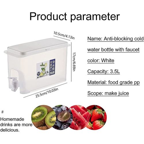 2L Fridge Beverage Dispenser With Faucet In Refrigerator Container, Colourless Iced Beverage Dispenser 0.92 Gallon Plastic Drink Dispenser with Spigot Refrigerator Bottle Drinking Water Dispenser Cold Kettle with Faucet Beverage Container Description: This water dispenser is the best PP material, so you can pour boiling water directly without fear of falling. Easy to clean, large capacity, with a lid on the top, sealed to keep fresh, equipped with a faucet, convenient and practical. It adopts a large-caliber lid, no need to unscrew, easy to open, convenient to add fruit, add ice cubes, and clean thoroughly, without dead ends. The water dispenser in the refrigerator. Make all kinds of cold drinks as you like. You can put fruits, tea, honey, milk, juice, and alcohol in the cold kettle. Allows you to drink cool water and drinks at any time in the hot summer. It is the best choice for health preservation and office rest. Specification: Color: Clear Size: 25.5*10.5*17cm Material: pp Capacity: 2L Application: making fruit juice, fruit tea, wine making, etc. Package Includes: 1 x Cold Drink Dispenser