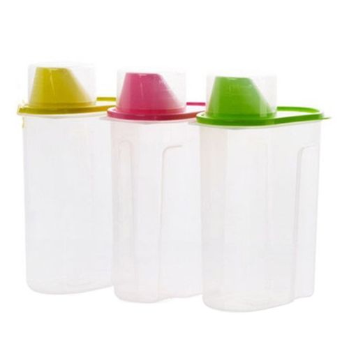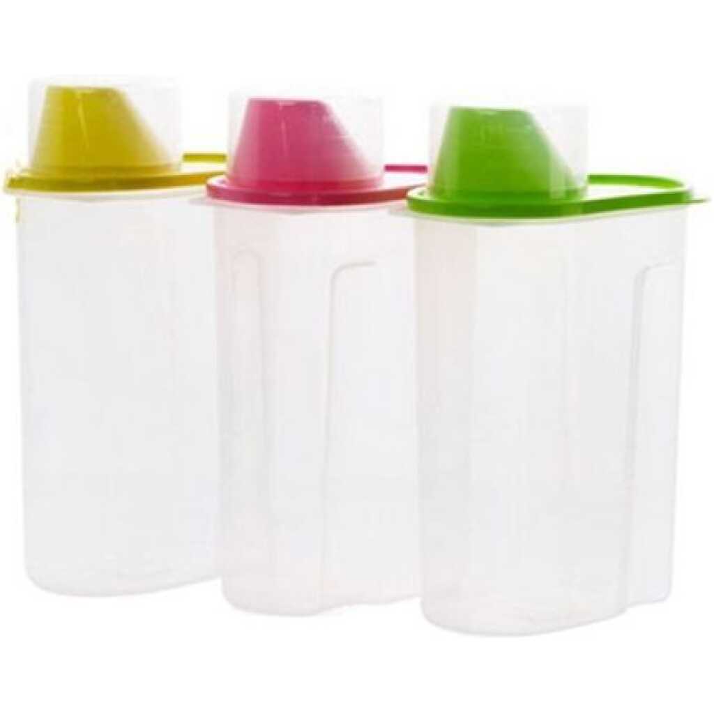 3 Piece 2.5 Food Plastic Storage Grains Cereal Containers. These practical storage containers are great for storing cereals, flour, rice, and much more. It will keep your kitchen pantry neat and organized while keeping your food fresh.