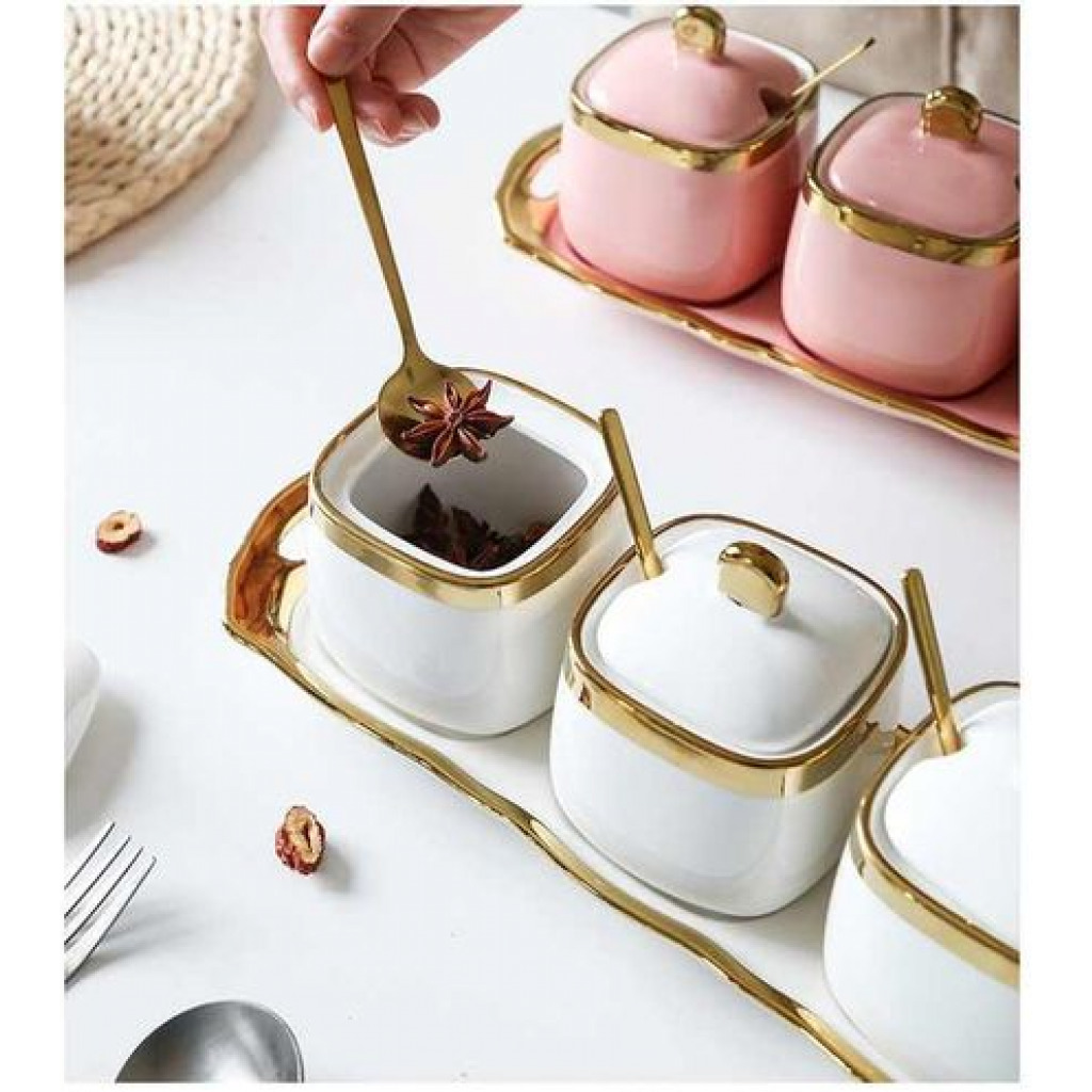 The perfect blend of beauty and utility, this Three-piece ceramic jar set is what you need to store your items attractively in your kitchen. The Set contains 3 spoons, 3 jars with lid and one tray. STYLE & VERSATILITY – Whether giving as a gift or using in your own home, these modern inspired canisters are offer the perfect blend of style and sophistication along with terrific versatility, these containers will surely add charm to any kitchen KEEPS CONTENTS FRESH AND DRY – Ceramic lid creating an airtight environment to keep contents dry, fresh, and free from insects or odors. SIMPLE, SOPHISTICATED, FUNCTIONAL – Set of 3 Jar with inspired canisters for sugar, tea and coffee only. MATERIAL AND CARE TIPS – Heavy duty ceramics are dishwasher safe. Its Dimensions are box dimension:- length: 12cm, breadth: 28 cm, height:12 cm, weight: 0.255 kg Jars