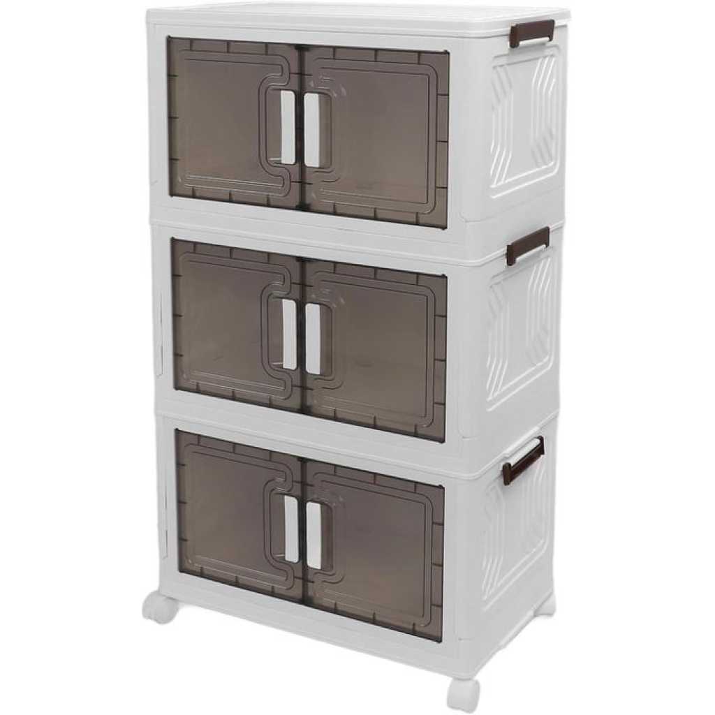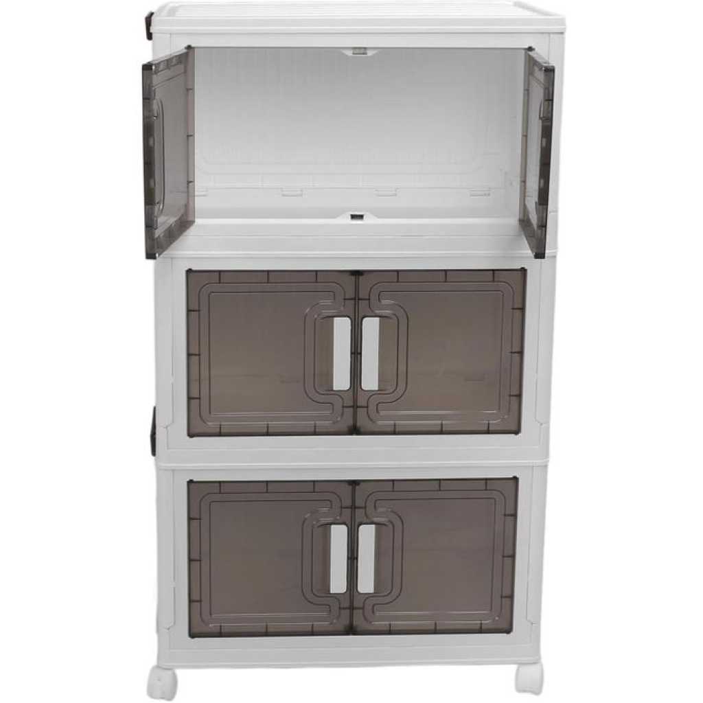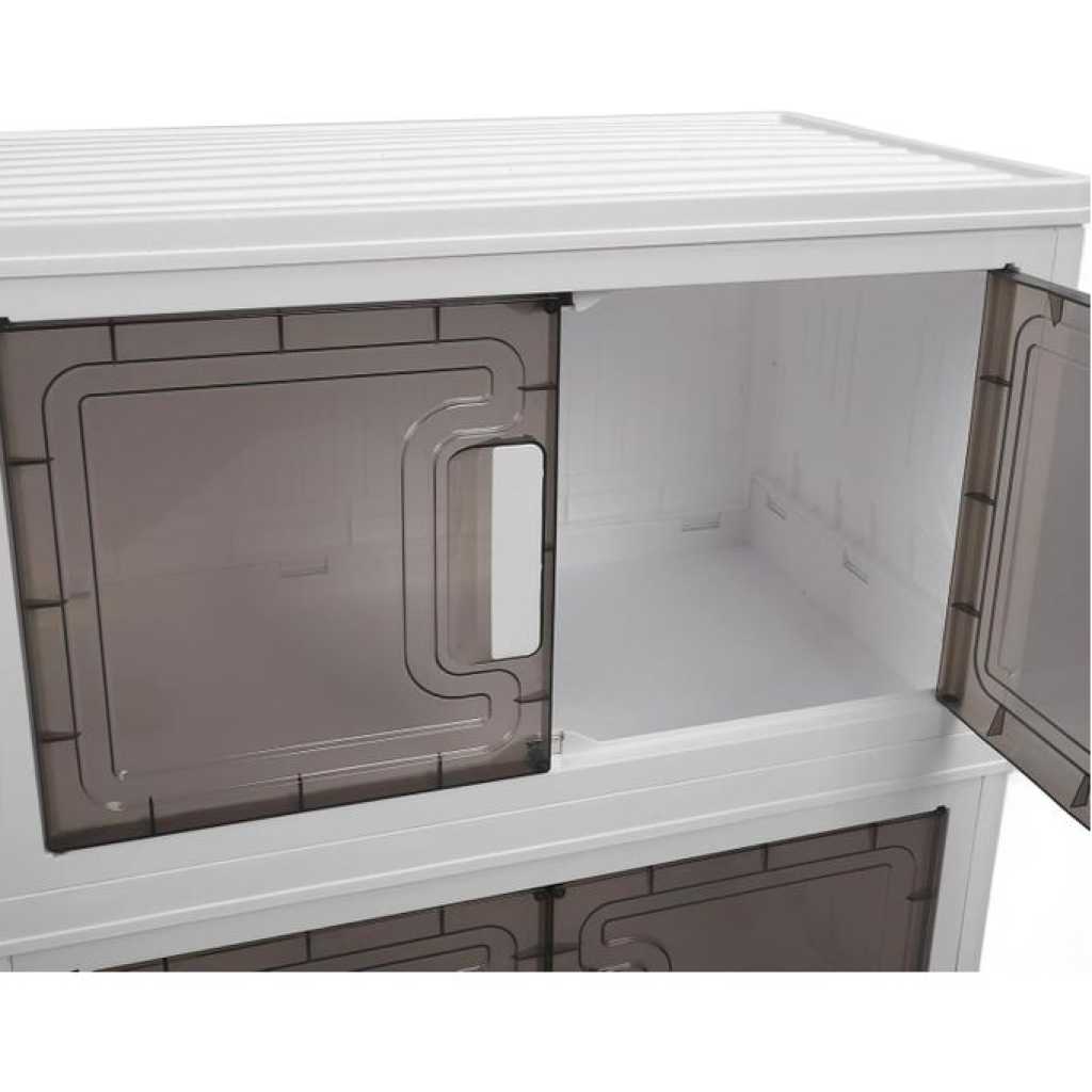 Key Features: Foldable and Easy Assembly: This storage bin can be folded flat when not in use, and assembly is a breeze, no need to keep instructions for reassembly or use tools. It takes just about 10 seconds to quickly piece together the components in a simple manner. Versatile Storage Solution: Ideal for organizing toys, crafts, photos, medications, snacks, and more. It is also a convenient storage space for garages, classrooms, closets, kitchens, bedrooms, bathrooms, offices, or food storage areas as an additional option. Double Door Design for Convenience: Featuring a double door design and comfortable handle, this storage container is easy to access and store items. The transparent design offers great visibility, making it easy to locate desired items while combining aesthetics and practicality. Easy Mobility with Wheels: The bottom of the folding storage bin features 4 wheels for effortless movement, and 2 wheels are equipped with buckles to secure them , preventing any unwanted shifting. PP PET Materials for Durability: Made of premium PP and PET, this storage cabinet is sturdy when assembled and can also be individually detached for separate use. The superior materials ensure a longer lifespan, strong weight bearing capacity, and reliable performance.