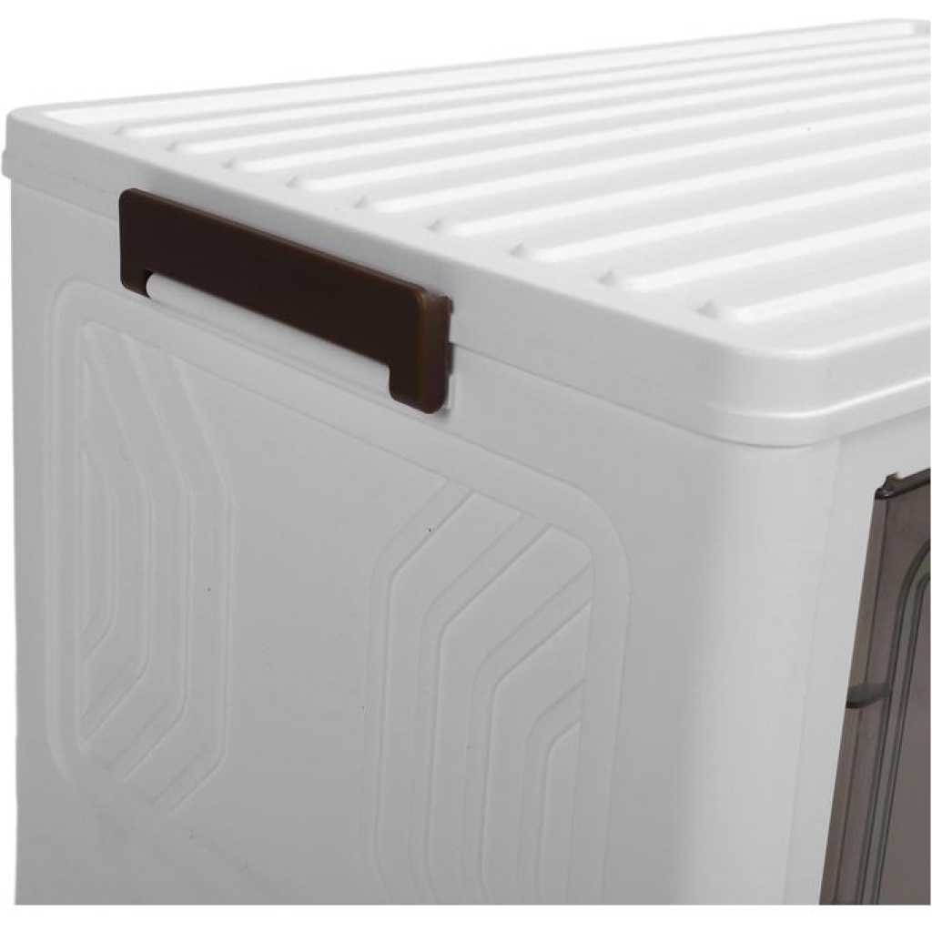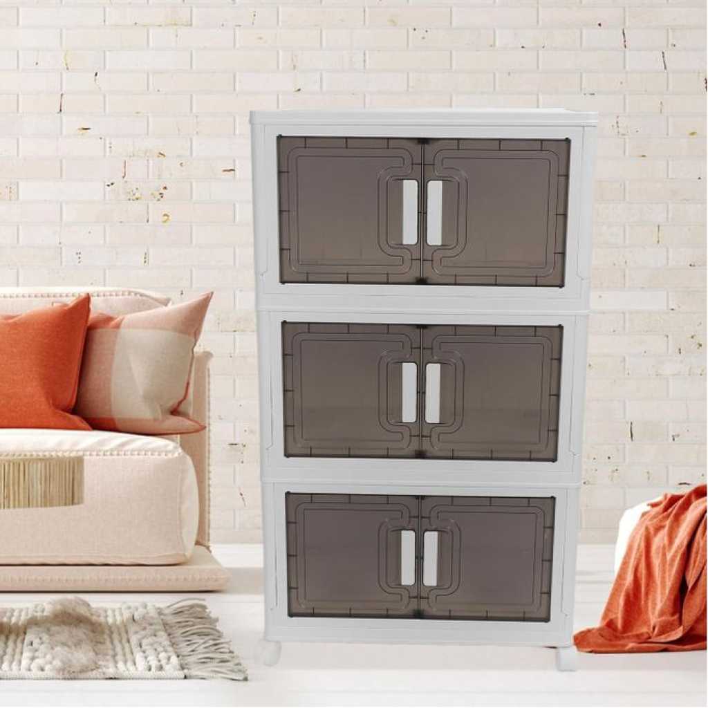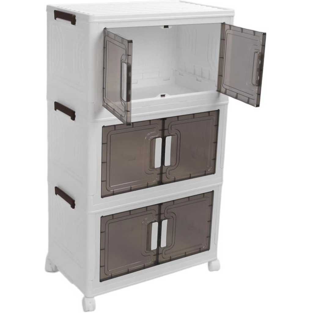 Key Features: Foldable and Easy Assembly: This storage bin can be folded flat when not in use, and assembly is a breeze, no need to keep instructions for reassembly or use tools. It takes just about 10 seconds to quickly piece together the components in a simple manner. Versatile Storage Solution: Ideal for organizing toys, crafts, photos, medications, snacks, and more. It is also a convenient storage space for garages, classrooms, closets, kitchens, bedrooms, bathrooms, offices, or food storage areas as an additional option. Double Door Design for Convenience: Featuring a double door design and comfortable handle, this storage container is easy to access and store items. The transparent design offers great visibility, making it easy to locate desired items while combining aesthetics and practicality. Easy Mobility with Wheels: The bottom of the folding storage bin features 4 wheels for effortless movement, and 2 wheels are equipped with buckles to secure them , preventing any unwanted shifting. PP PET Materials for Durability: Made of premium PP and PET, this storage cabinet is sturdy when assembled and can also be individually detached for separate use. The superior materials ensure a longer lifespan, strong weight bearing capacity, and reliable performance.