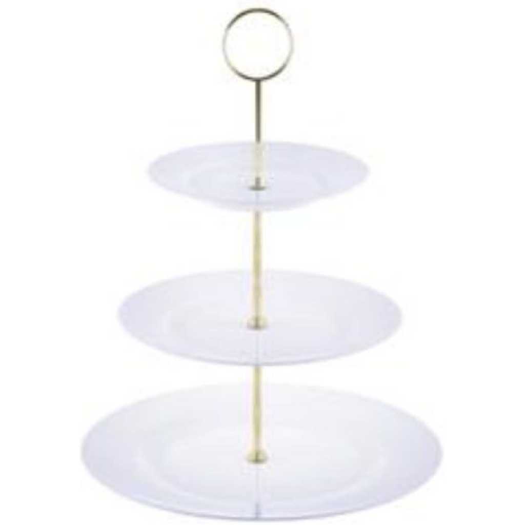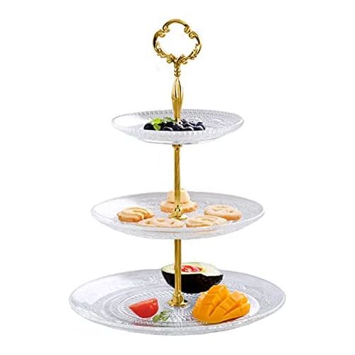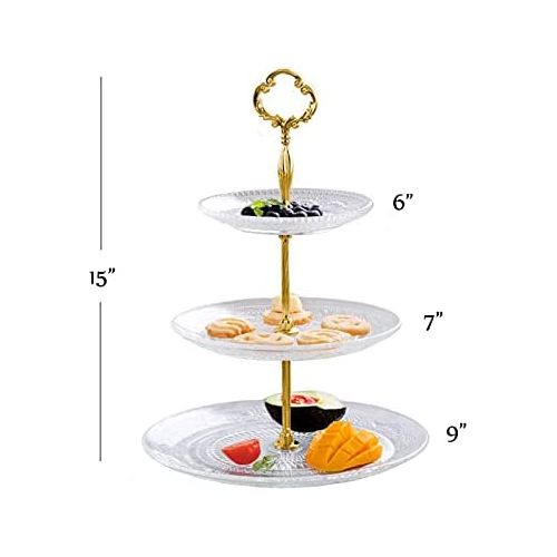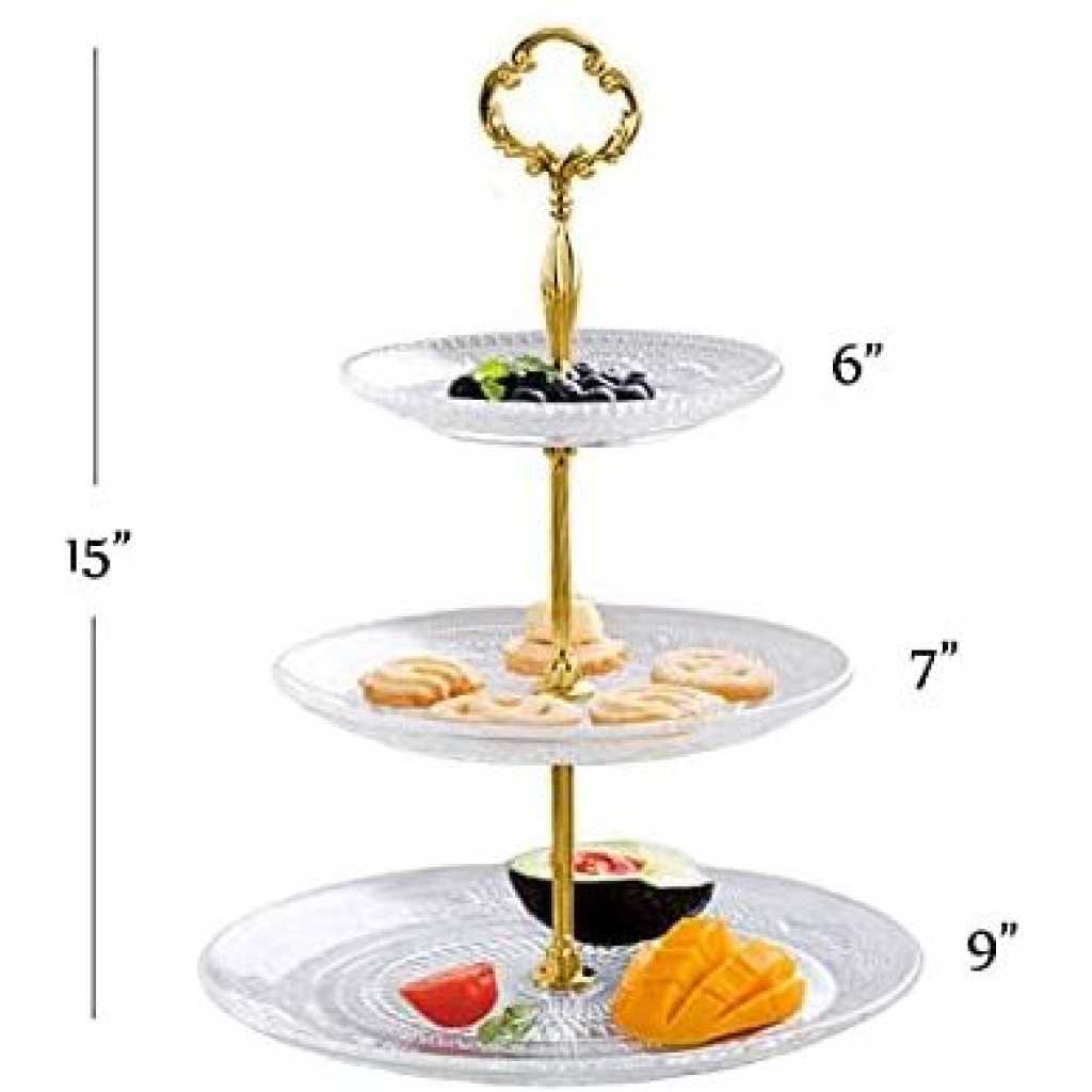 Key Features: 3-Tier Glass Cake Stand Serving Tray Tower Dessert Holder Pastry Serving Platter Display Decoration- Clear. Three-Tier Serving Dish Intricate Detailing Brass Metal Rod with Carry Circle Durable Borosilicate Glass Stain and Odor Resistant Handwash Recommended Glass embossed design and a golden crown. Gold-plated handle, smooth and scratch-free edges. Easy assembly, disassembly, and cleaning. Space-saving and two choices for 2-tier and 3-tier. Perfect gift, use at weddings, tea parties, baby showers, or birthdays