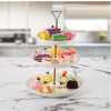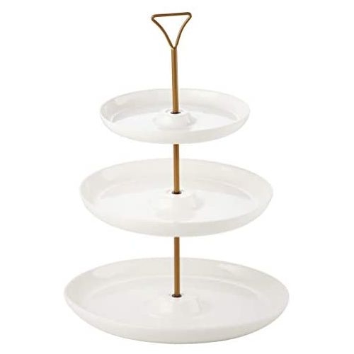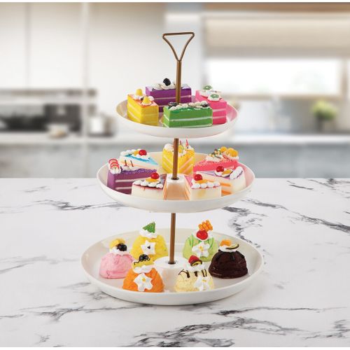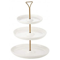 Key Features: Three Tier Serving Dish Intricate Detailing Brass Metal Rod with Carry Circle Stain and Odor Resistant Handwash Recommended Great for all occasions Ideal for holiday parties, weddings, birthdays and other events Porcelain are dishwasher and microwave safe Plates Dimension: 18cm, 23cm and 28cm