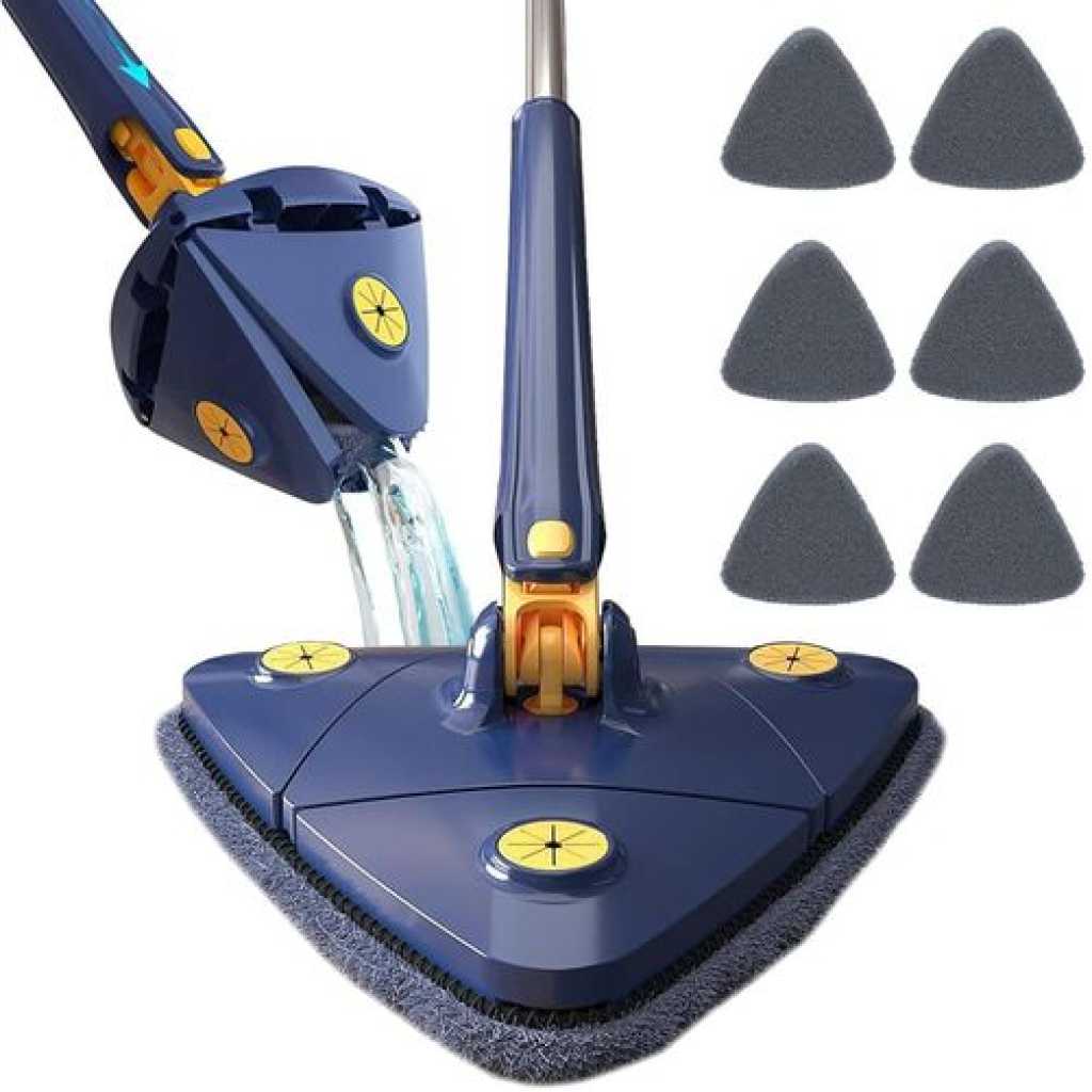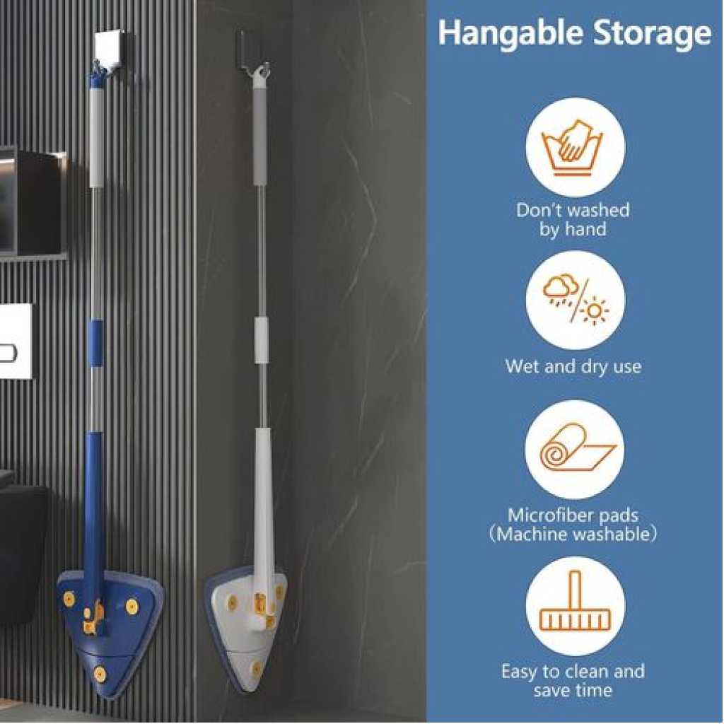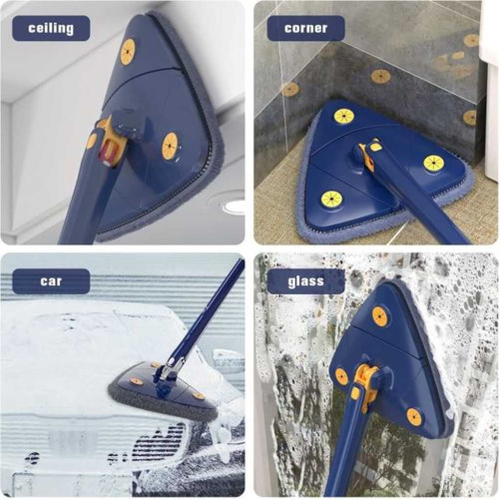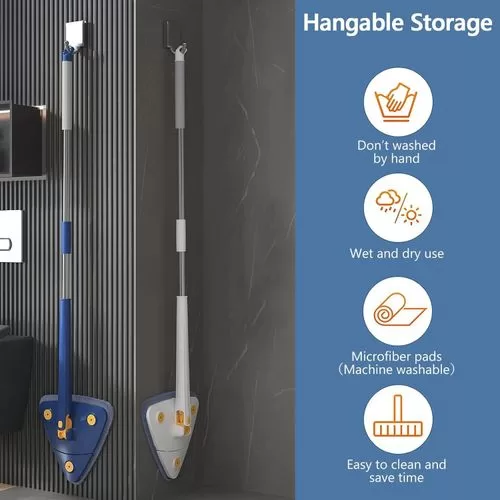 Key Features: Unique design: our microfibre mop with the latest triangular design, the 360° rotating mop head of the cleaning mop allows you to leave no dust in the dead corners. The mop is removable, you will receive a microfiber mop with 4 reusable washable mop pads and you can change the mop head at any time. Deep cleaning: simply attach the wet mop pad to the bottom of the frame, adjust the handle and lock it to adjust it to your height. Connect the steel tube freely up to a length of approx. 130 cm. You are not afraid to be wiped in height. Double cleaning and cockroach integration save time and effort. Premium material: the adjustable mop comes with a thickened and compressed microfibre mop cloth, imitation hand wash cleaning design, integrated push-pull automatic water squeeze function, free your hands. No need to climb stairs or bend down to clean. Save time. Wet and dry cleaning: Strong water absorption and decontamination ability, can be used to remove dust and stains, making cleaning convenient and fast. Dry Wipe: dry wipe uses electrostatic adsorption, which can absorb small dust particles. Wet Wipes: wet wipes have fast water absorption and stain removal and absorb dirty water. Multi-scene application: the telescopic rotary mop can be stored in vertical corners, takes up less space and dries quickly. It can be used anywhere cleaning is required, especially for dust on tables, sofa beds, wall corners, ceiling corners and