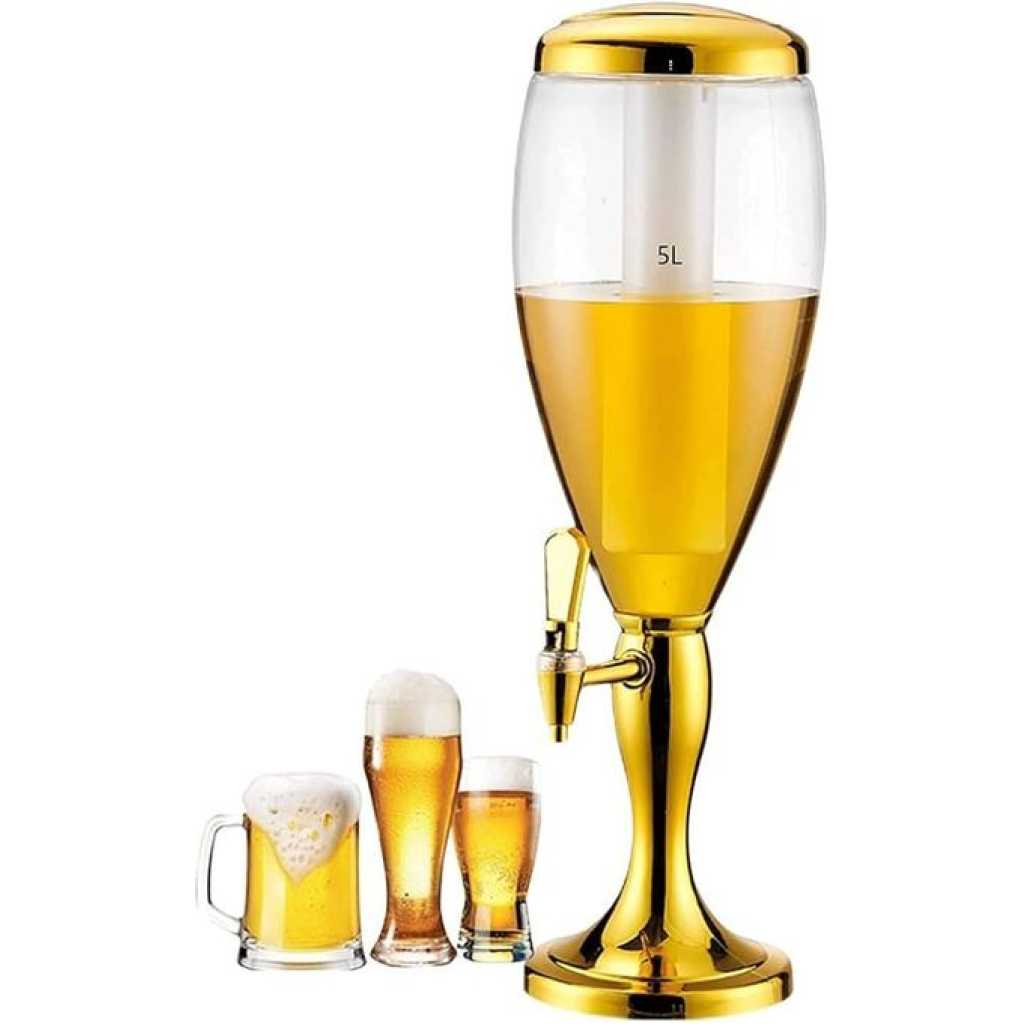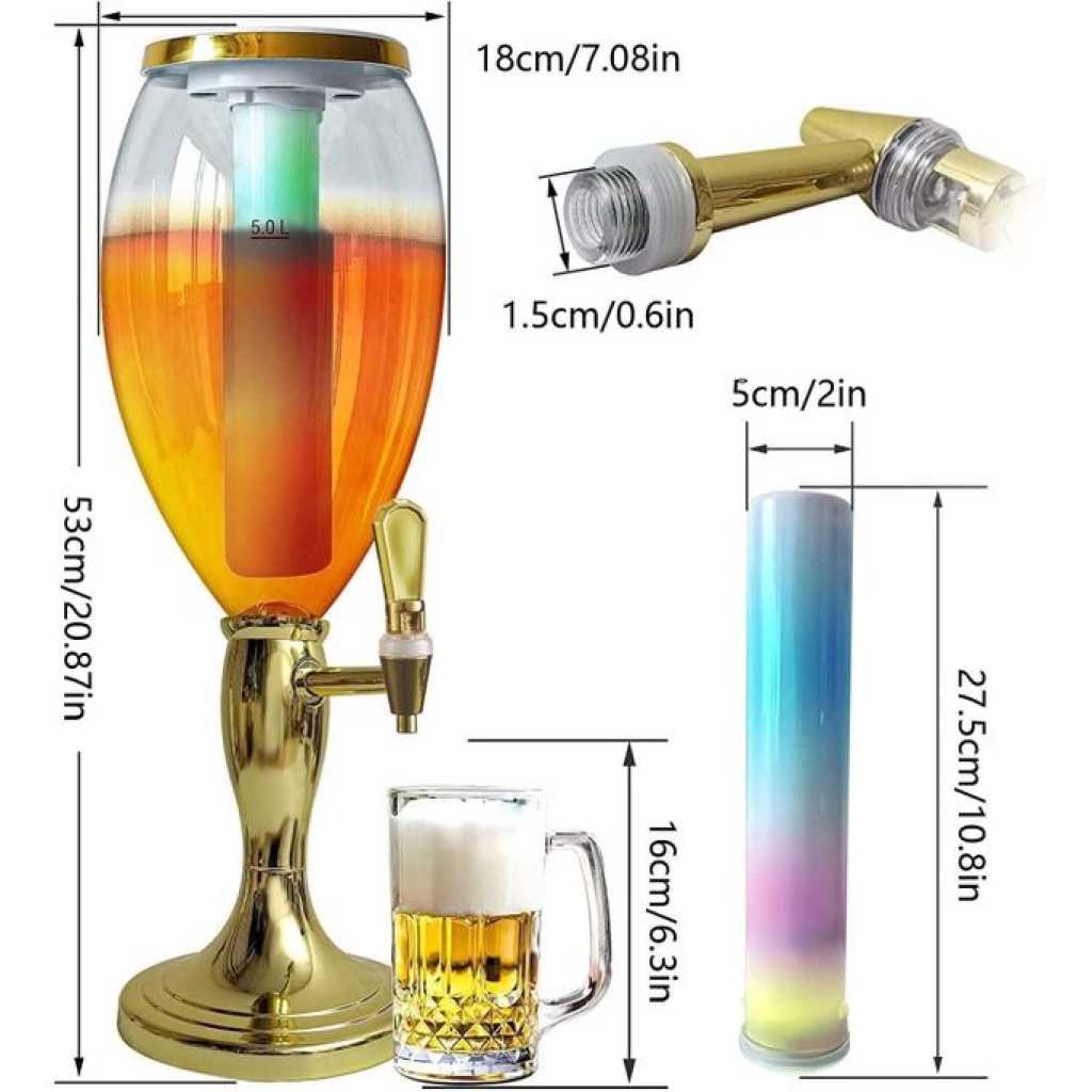 3L Beer Tower Dispenser, Tabletop Beer Tower with LED Lights,Tap And Removable Freeze Ice Tube, Durable Beverage Tower Dispenser Perfect for Party Home Bar Family Buffet Restaurant UNIQUE GIFT FOR BREW ENTHUSIASTS: The Beer Tower is the perfect gift for any brew enthusiast. Makes a great gift and souvenir for all festive and non-festive occasions such as birthdays, anniversaries,Gameday, party, Father’s Day, Christmas, New year, Thanksgiving, Halloween, and more! it’s a beer accessory that will always stand out. Name: 5L Beer Tower Drink Dispenser w/Tap, Freeze Tube, Led Light To Keep Beverages Ice Cold Large Beverage Tower Dispenser for Bar Family Buffet Restaurant FEATURES. Transparent Container Removable Ice Tube Steel core faucet Steady Flow LED Lights 【PREMIUM STURDY BASE】Our weighted, solid plastic base ensures that your beer tower will never tip while dispensing drinks. There are several rubber bumps on the bottom to increase the beer dispenser friction with the countertop. It locks when twist and is easily removable for cleaning. 【EXTRA LARGE CAPACITY】The capacity of this beverage tower dispenser is 5L/5.3 Qt, about 170 oz. Enough for a whole party night. There is a removable ice tube inside it for ice cubes.On party night, turn on the colorful LED lights of the beer tower, enjoy the cold fresh beers, which will bring you a different experience. 【WITH SPIGOT AND STAND】The liquid flows out at an appropriate speed, neither too fast to splash on clothes nor too slow to wait for a long time. The nozzle of the tap is made of metal to resist corrosion.It can be dispense cold beer, cocktail, whiskey, soda, fruit juice, margarita, champagne, etc