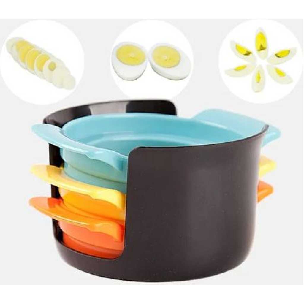 4 In1 Egg Slicer Cutter For Hard Boiled Eggs-Multi-colour. This handy egg slicer cuts egg slices in your house or while traveling. High-quality Contains wires that easily slice boiled eggs Just put the egg on the slicer and snap the flipper. You have several slices of eggs in a moment Cut eggs into slices and/or segments for sandwiches and salads. here is a tool that can also pierce eggs. Notice: When cutting eggs, you must have A certain speed to make sure that incision formation and egg piece are uniform. This is very handy & easy to use to make delicious eggs slice in your house or while you are traveling. It can be folded easily to fit your Ba. The sleek and stylish international design sets it apart from any competition. Convenient mid-size design with high-quality wires. This slicer gives a very beautiful and attractive shape to eggs sliced for serving to your guest or family member. This is very helpful to make decor to your dish for impression