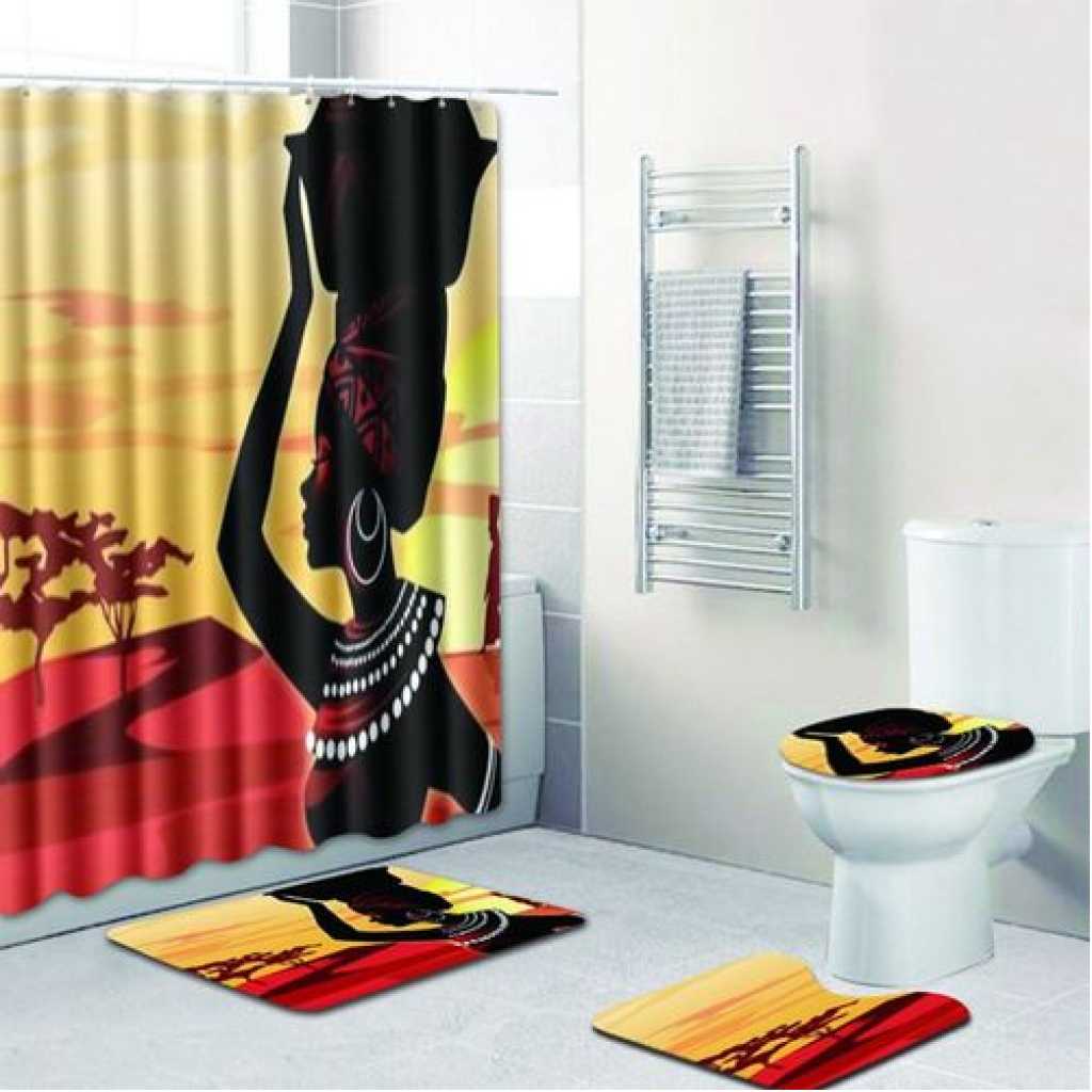 Waterproof Shower Curtain With Toilet Cover Mats Non-Slip PREMIUM MATERIAL: This afro girl shower curtain is made of eco-friendly polyester, has a good waterproof effect. The non-slip bath mat/U type rug made from flannel, durable, non-toxic and safe, the best choice for your family. CLASSIC DESIGN: This ancient egyptian shower curtain adopt HD print and featuring vivid colors, crisp lines and delicate hemming, will bring you a different novelty and stylish experience SIZES INFORMATION: African woman desert shower curtain size: 70″ L × 69″ W; bathroom mat size: 23.6″ L × 15.7″ W; O shape toilet lid cover size: 16.5″ L × 14.6″ W; U shape rug size: 17.7″ L × 15.8″ W. Good size suitable for most bathrooms. EASY TO INSTALL & USE: We gift 12 strong hooks free for you. You don’t have to worry about how to install it. 12 reinforced top-header grommets for hanging simply; Non-slip bath mat/rug and toilet lid cover matching. Multipurpose: Excellent for showers and bathtubs for your home, campers, motels, hotels, dorms and more. Renovate the bathroom quickly and thoroughly without paying an expensive fee.