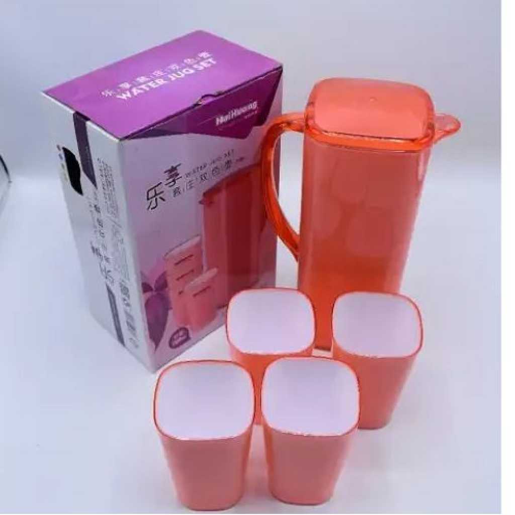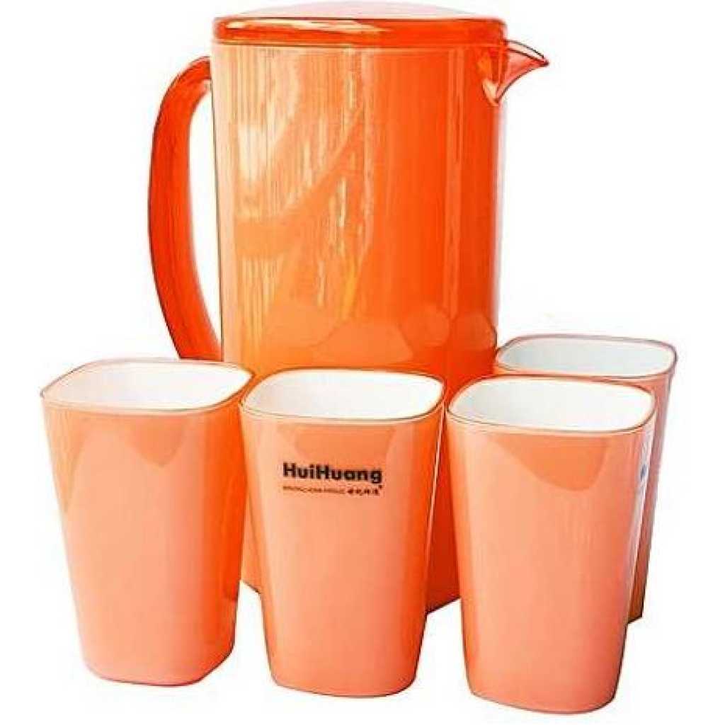 4 Piece Melamine Juice Tumbler Cups And 1Piece Jug Water Set-Orange. Serve your beverages or chilled water in style with this melamine Water Jug and cups. The water jug and glasses set feature an opaque design and come in a pleasant shade. The water jug also comes with a lid to avoid spills and the glasses are lightweight, yet quite sturdy in structure. This jug and tumbler set is made of sturdy, lightweight and strong BPA Free plastic, so it’s great for picnics, garden parties or everyday drinks. You get 4 cups (280ml) and 1 jug (2.8 L) suitable for water, fruit juice, cocktails and iced tea, beautiful and practical with a cool colorful look. Large enough capacity to provide and store refreshing drinks and enjoy cordials or cocktails with your family or to entertain your guests; the beautiful easy sturdy grip handle makes pouring effortless with this jug and can underline the beauty of the kitchen and leave a deep impression on the guests. Catering to the modern fashion trends, perfectly decorated home life. Our plastic water jug is equipped with 4 cups and comes in different colors choices. It has large enough capacity to provide and store refreshing drinks for your family or to entertain your guests. They are very easy to store, the tumblers stack inside the jug to save space, which is great for travel. The cups and the jug are durable, making them perfect for using at busy outdoor occasions such as BBQ’s, picnic’s, camping, garden parties, and wherever else your festivities take you. And they are dishwasher safe too.