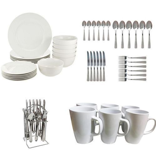 Key Features: 6pcs Dinner Plates 6pcs Side Plates 6pcs Tea cups 6pc soup bowls 6 stainless steel forks 6 stainless steel table spoons 6 stainless steel tea spoons 6 stainless steel Table knives 1 Stand holder