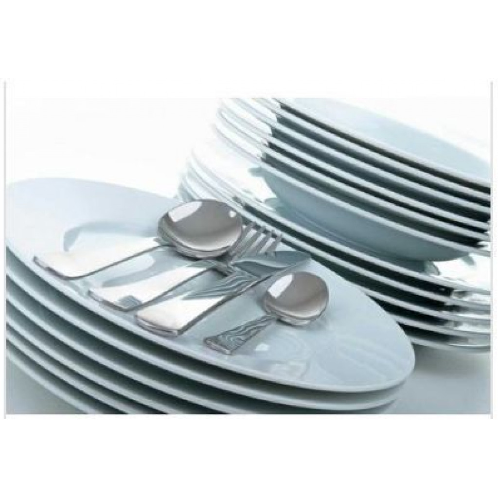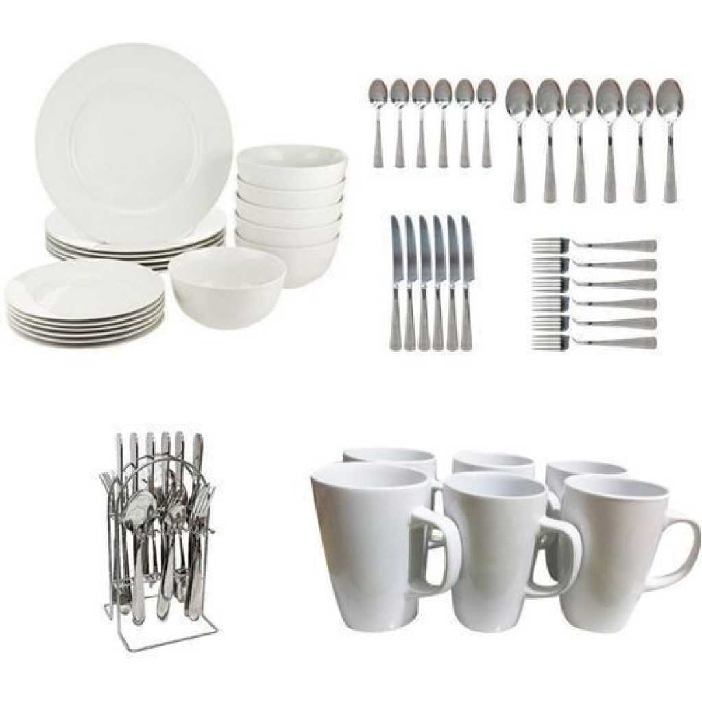 49pcs Ceramic Dinner set -White Enjoy your meals on this lovely shaped set with dinner plates, side plates which are used for serving break fast, bowls which are used for both sauce and cereals. It includes:6pcs Dinner Plates6pcs Side Plates6pcs Tea cups6pc soup bowls6 stainless steel forks6 stainless steel table spoons6 stainless steel tea spoons6 stainless steel Table knives1 Stand holder