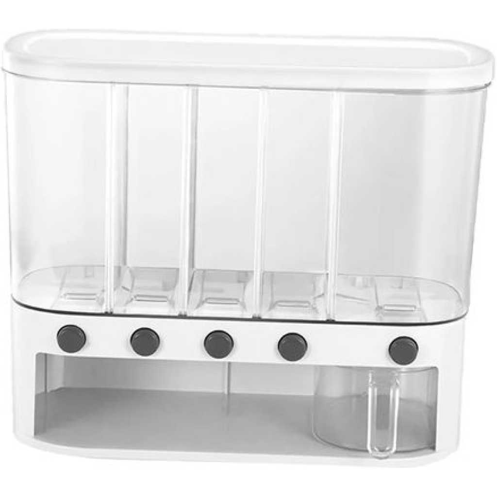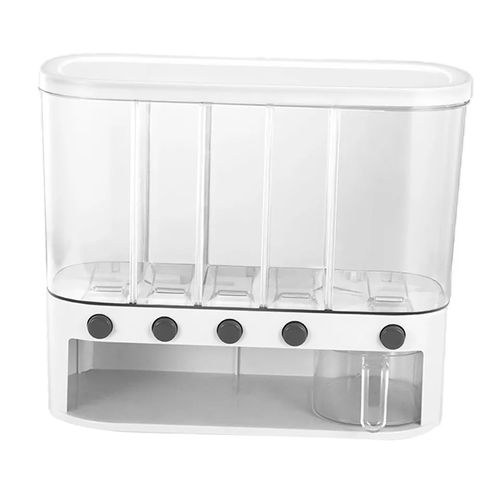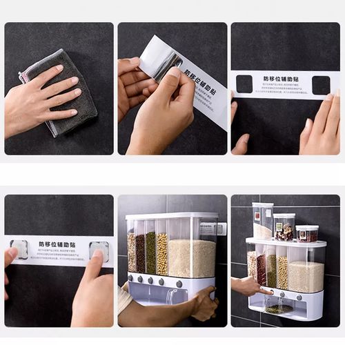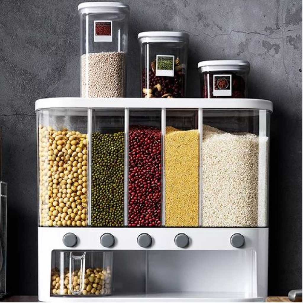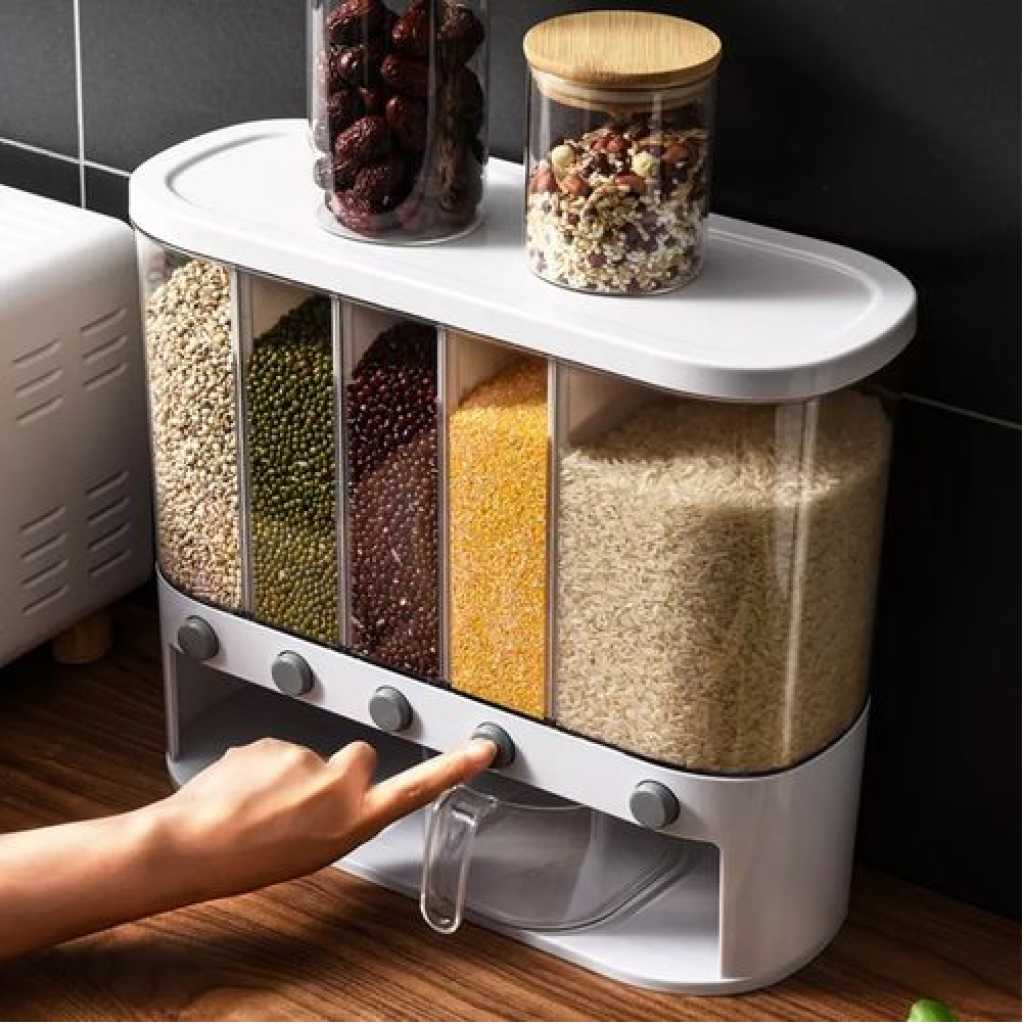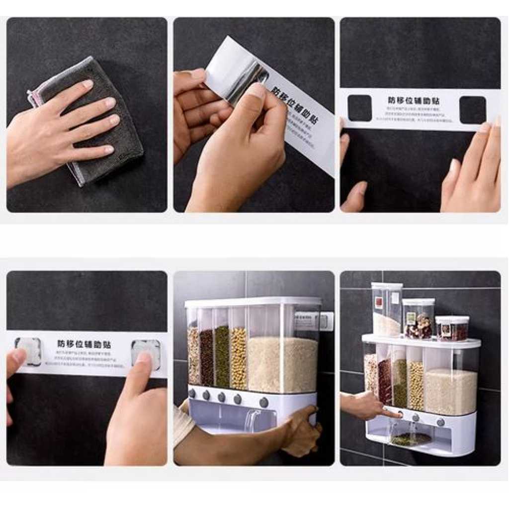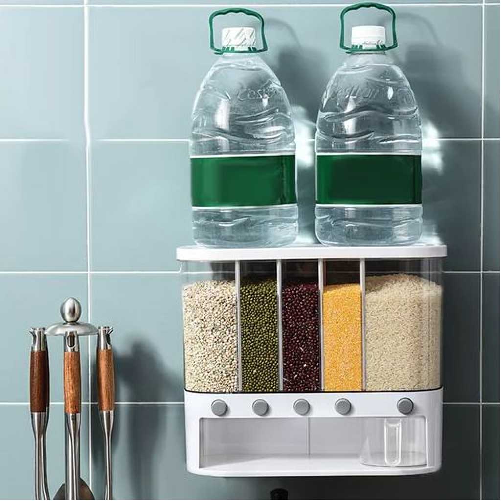 Key Features: 5-Grid Wall Mounted Storage Container 12L Food Dispenser Rice Bucket LARGE CAPACITY: Our Rice Barrel can hold 12kg of food, such as flour, rice, nuts, beans, snacks, cereals, and pet food. etc, meet your need in the kitchen! (Capacity may vary with different food densities). AIR-TIGHT & LEAKPROOF: Cereal dispenser with BPA Free plastic, A great sealed container can keep your food safe from moisture and any pest, enjoy fresh food every day. CONVENIENT TO USE: You can simply Press the round button to access an amount of rice easily, Fits under the kitchen counter or cabinet, keep the Kitchen neat, and frees up space in the pantry. DRAIN MEASURING CUP: Dry Food Storage Container including a measuring cup making every take-out rice neat and clean, measuring food easier. CLEAR VISIBILITY: The cereal storage containers are designed with transparent visual scale windows, so you can take a glance for convenient food management.