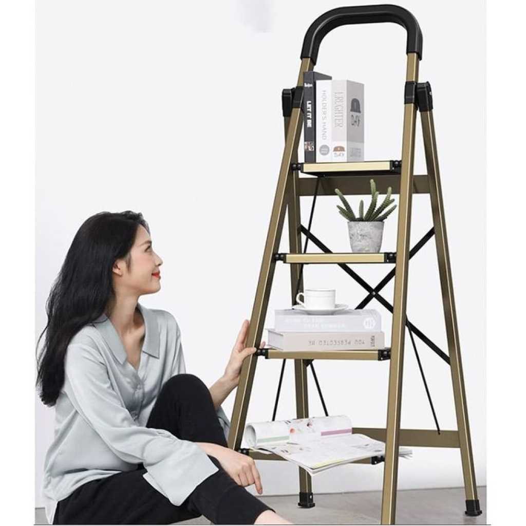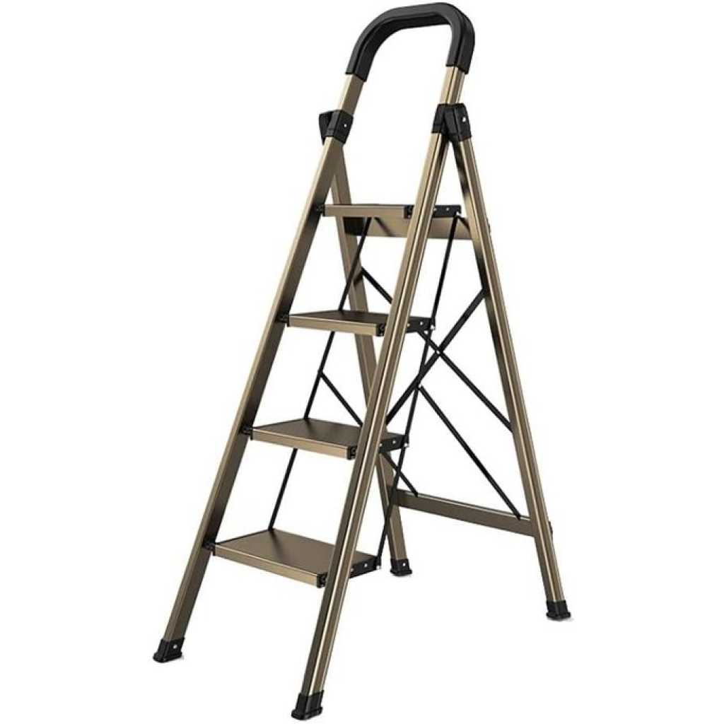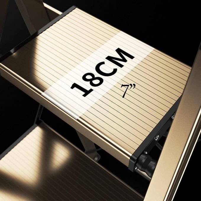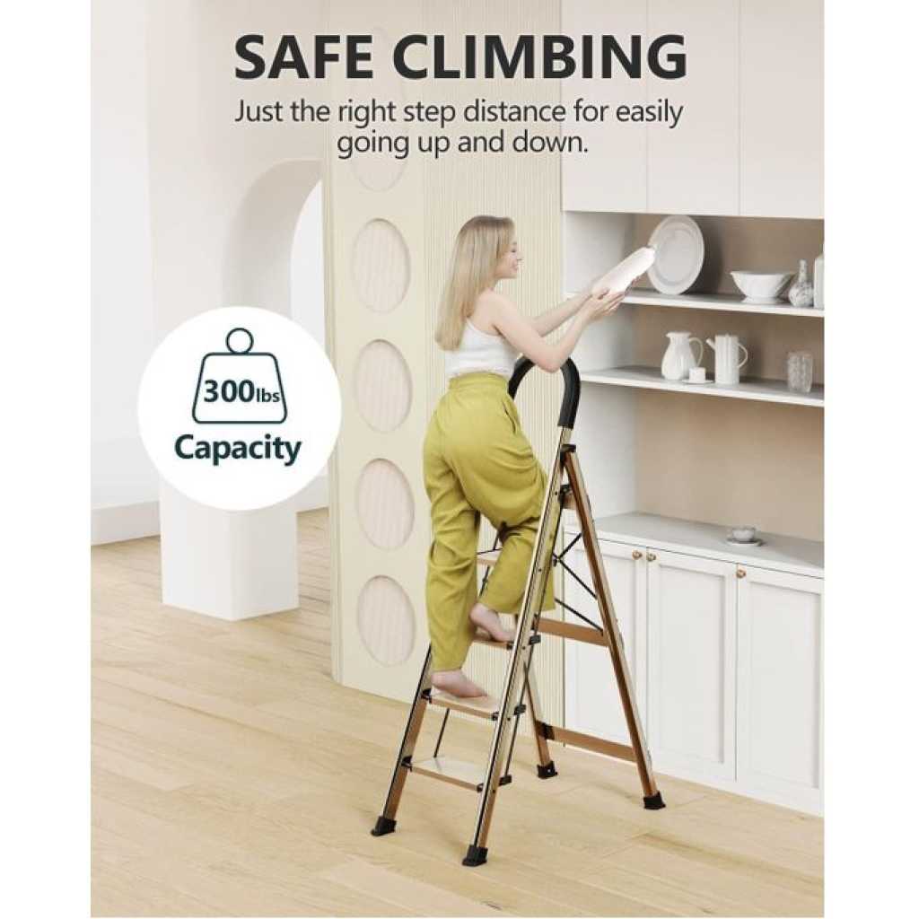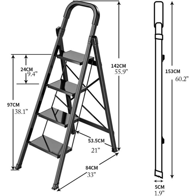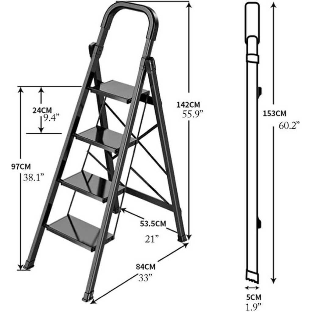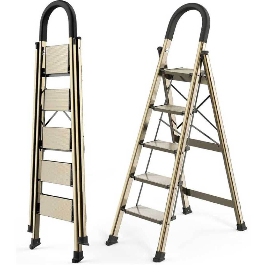 5 Step Ladder, Folding Step Stool with Anti-Slip Wide Sturdy Pedal with Convenient Handgrip, Portable Lightweight Aluminum Stepladder for Home, Office, Library Indoor 5ft Stepladders With Rubber-cotton Armrests Versatility: With a convenient handle, the ladder is easy to climb and carry. It is ideal for your home kitchen and shop, and can also be used as a chair. Product name: Ladder Expanded size: 84×53.5x142cm/33x21x55.9in Folded size: 5x153cm/1.9×60.2in Weight: 5.12kg Material: aluminum alloy Note: The product only contains 1pcs ladder It is very suitable for working at different heights and can be reused well. Key Features: 5 Step Ladder, Folding Step Stool with Anti-Slip Wide Sturdy Pedal with Convenient Handgrip, Portable Lightweight Aluminum Stepladder for Home, Office, Library Indoor 5ft Stepladders With Rubber-cotton Armrests his step stool is fully assembled, very light and easy to transport indoors or outdoors. The rubber-cotton armrests are closer to your hand, soft and more comfortable; two-way non-slip foot pads, the foot pads firmly grasp the ground and do not move back and forth. 18cm/7in wide pedal, deepen the texture and make it more slip resistant, and the texture effectively enhances friction After folding, the thickness is only 5cm/1.9in. The alloy beams are uniformly stressed and stabilize the foot of the ladder, which is safe and stable. 5.12kg weight, lightweight body, girls can easily lift with one hand; triangular mechanics design, scientific support, effective safety guarantee
