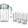 This beautiful set has one glass jug with a lid and 6 long glasses.They are all made of very strong and clear glass,which when handled with care will last for a very long time.The glasses are Multipurpose and can be used for decoration purposes as well.The jug has a tight plastic lid to store your drinks safely.
