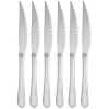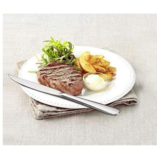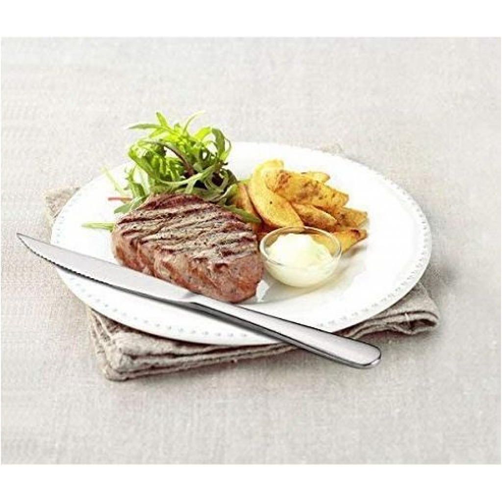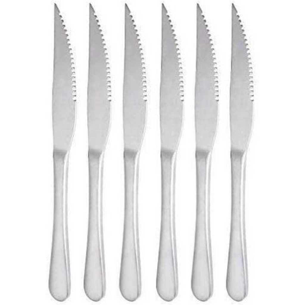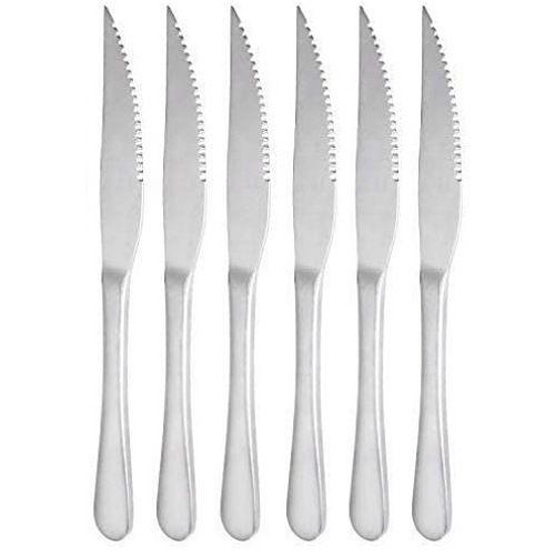 6 Pieces Of Table Steak knives Cutlery Set, Silver HEAVY-DUTY STAINLESS STEEL: Made of 18/10 stainless steel, nontoxic and tasteless, corrosion-proof and heat resistant. The great weight, stylish appearance and wonderful hand feeling all tell a decent quality. IDEAL DINNER KNIFE: Thickened knife body, clear and sharp knife tooth, ergonomic handle. With its help, you can cut the delicious steak easily and elegantly. We are sure the guests will be impressed by such a enjoyable dinner with you. STYLISH APPEARANCE : Polished surface, flared handles, well-proportioned tooth. A delicate looking brings you more fun when you use the spoon. EASY TO CLEAN: Dishwasher safe. Polishing brings a smooth surface which resists solid food remains. Cleaning is a breeze after every use. Wipe it dry immediately, do not soak in water for long period of time. COMES IN 6 PACK: Save your money and time. You can use them with your families, friends or lovers. It is also a good choice as a gift.