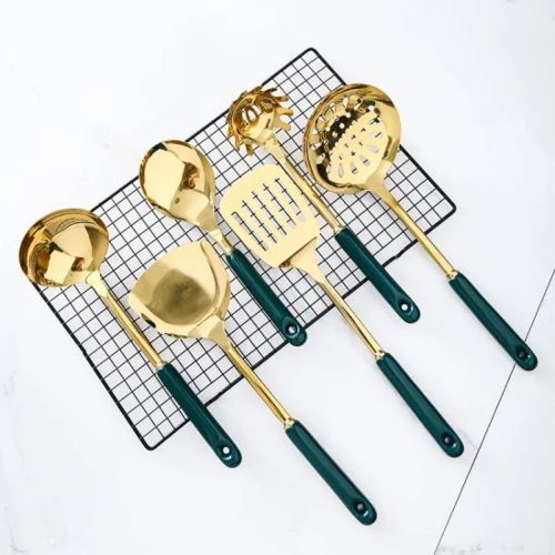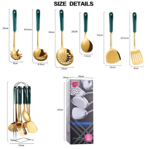 7 Pc Kitchen Tool Cooking Utensils Serving spoons Minimize countertop messes and reduce cross contamination of foods with the Elevate tool collection. This set includes 7 essential kitchen tools: flexible turner, slotted spoon, slotted turner, ladle, spaghetti server and solid spoon. These innovative tools have a weighted-handle system and small foot under the handle, so the utensil can be placed down without having the end touch your work surface. The rotating stand neatly stores your tool set and features a non-slip Steel base. Stylish and durable, it looks great on the kitchen worktop. Perfect for use with all kinds of cookware, the heads won’t scratch and are heat resistant up to 480°F. Handles are ergonomic and have a comfortable feel. All surfaces that come in contact with food are BPA free.