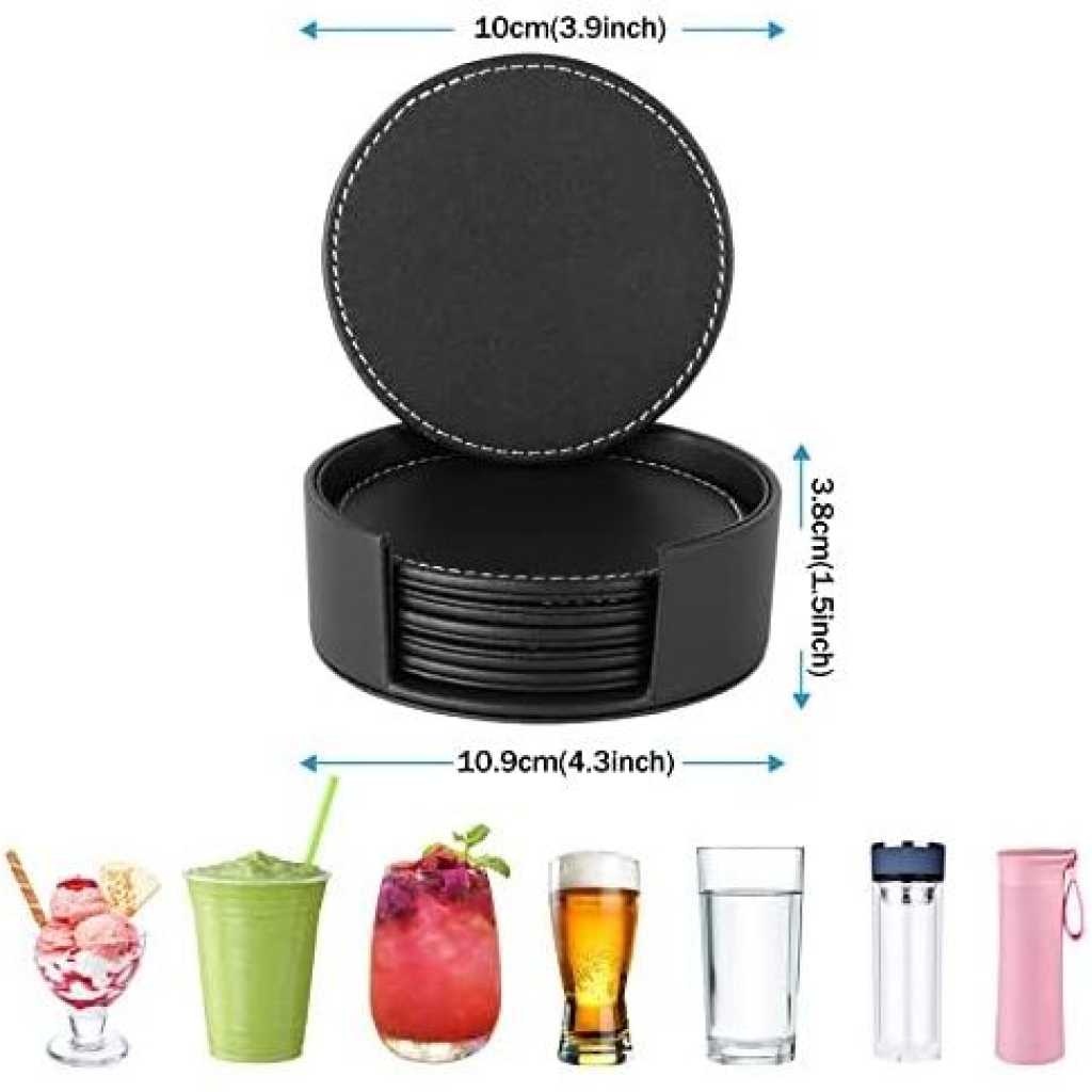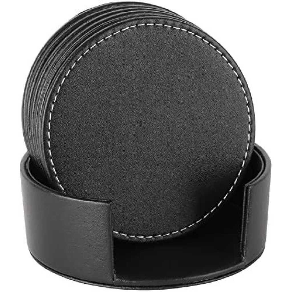 Key Features: 7 Piece Leather Drink Coasters Round Cup Mat Pad for Home And Kitchen – Black MODERN DESIGN: Leather coasters set with holder(6 pcs per set). Well-selected double-deck PU leather for better heat insulation and durable use. Each side is leather and sewn together by a white thread which looks really nice, fashionable, and luxurious. SAFETY MATERIAL: Leather Coasters are made of high-quality PU leather material, eco-friendly, with no smell, lightweight, durable, non-slip, and water resistant. EASY TO CLEAN: The leather coasters set is water resistant, which can be simply washed under running water, then wipe with a dry cloth, and re-use immediately. EXTREMELY USEFUL: Keep your furniture from water marks and damage. The coaster set is suitable for all cups, glass, and mugs, and can be used for both hot and cold drinks such as spoon rest, barware set, wine, beer, and other beverages. FRIENDLY REMINDER: All CARAWAY leather coasters are backed up with 30 days return policy and lifetime-friendly customer service. If any questions please do not hesitate to contact us, we are always here and ready to help.