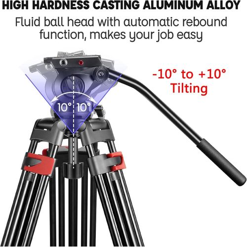 Key Features: [Fluid Ball Head] The ball head is cast by a magnesium-aluminum alloy, which is incredibly sturdy yet lightweight. The tripod weighs 9.04 pounds (4.1 kg) and supports 33 pounds (15 kg). The head provides a safe and stable platform for cameras. It is ideal for large cameras and professional camcorders. [The Three-Dimensional Head] The fluid ball head features a pre-set counterbalance with a fair amount of spring-loaded tension. The head has three drag adjusters, which can control the head flexibly: 1. The head can rotate 360° horizontally. 2. The head can tilt up and down +90° / -70°. After releasing the pan axis, the hydraulic device in the head will spring back to level. 3. The head can adjust the angle or leveling at will within the sphere of +10° / -10° hydraulic. [The pans and tilts are smooth as silk.] The components that make up the fluid head are firm and precisely connected. They are separated by damping oil to ensure very smooth pans and tilts. You will have a good experience while using it. [Universal QR Plate and the Pan Axis] Quick-release plates come with a 1/4″-20 screw, and a 3/8″-16 screw tored in a thread under the plate, offering a sliding range of +30/-30mm – to enable travel capabilities. The flat base mount with a standard thread makes the head suitable for most DSLR rigs, compact camcorders, and digital cinema cameras. The pan axis can be installed on the left or right side according to your needs. [Legs and Composite Footpads] Three-section aluminum column legs can be quickly extended and retracted by locking buckles-ideal for quick transitions. The tripod consists of composite footpads, and you can choose flat feet or spikes. The anti-slip rubber feet can be used on a smooth floor. The other is a composite nail mat that can provide exceptional grip to keep the camera steady on rough ground. The footpads of the tripod are suitable for all forms of land/ground.