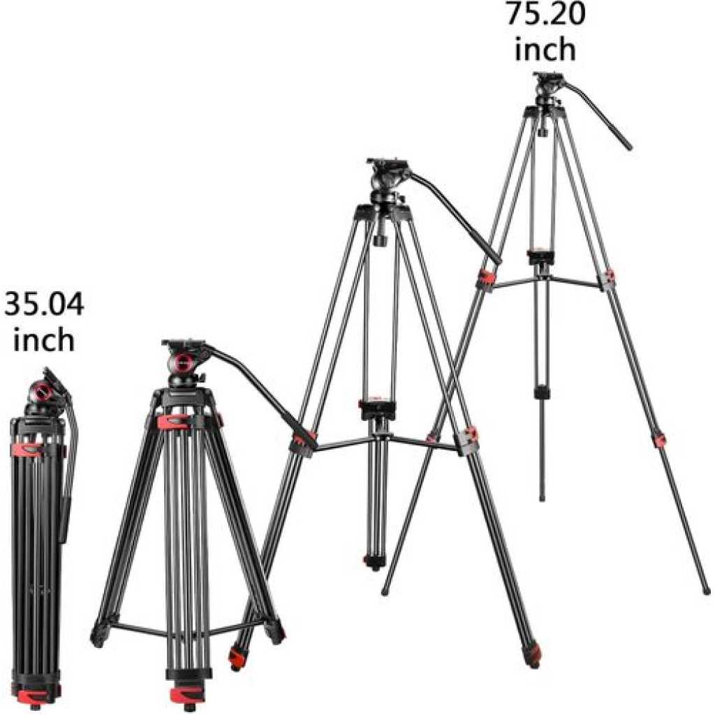 72 Inches Video Tripod, Professional Heavy Duty Aluminum Tripod System, 360 Degree K3 Fluid Head with Carry Bag, DSLR Camcorder Camera, Max Loading 33LB ( Black What Stands Out Sturdy Construction Crafted from heavy-duty materials, this tripod ensures stability and durability, supporting up to 26.5 pounds. Ideal for professional use, it withstands the rigors of filming in diverse environments. Fluid Head Design Equipped with a 360-degree fluid head, it allows for smooth panning and tilting. This feature enhances video quality by providing seamless transitions, critical for dynamic shooting scenarios. Extended Height Standing at 72 inches, this tripod offers impressive height adjustments to capture unique angles. Perfect for both DSLR cameras and camcorders, it empowers filmmakers to unleash their creativity without constraints. Product Details 【Heavy Duty and Stable Design】 Max Loading Capacity 26.5 lbs. Professional aluminum twin-tube tripod has its own bubble level on tripod leg. The ENLARGED adjustable anti-skid rubber pads with 75 mm bowl base provide more stability. The triangular center system prevents the tripod from folding when on uneven ground. 【Fluid Head with Double Bubble Levels】Professional camera head, with a 360-degree scale for easy connection. The dynamic balance system makes the fluid head run smoothly. It tilts +90/-75° vertically and rotates 360° horizontally. The 2-section detachable handle can be installed on the right or left. TWO level gauges helps adjust the level according to demand. 【Fast Release Plate】 Equipped with a 1/4-inch camera screw and a spare 3/8-inch camera screw, which is very suitable for most brands of cameras and camcorders. The aluminum alloy safety button on the video head prevents the device from falling. 【Easy to Assemble】The ergonomic flip locking system makes the legs locking more fasten, and unlocking more convenient and fast. And our unique Anti-Loose System prevents the leg being loose effectively. 【Parameters】 3 Bubble Levels – 2-section handle – 26.5 lbs Loading Capacity – 34″ to 72″ Height Range – Tilt Angle +90° / -75° – 360° Panning – Product Weight 9.9 lbs