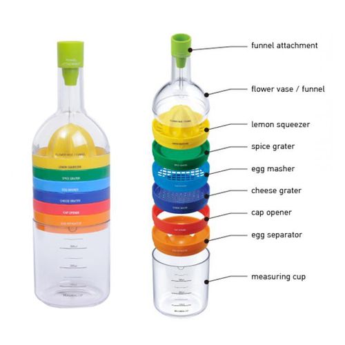 8-in-1 Kitchen Tool Set Multipurpose Bottle Funnel, Flower Vase, Lemon Squeezer, Spice Grater, Egg Masher, Cheese Grater, Cap Opener, Egg Separator, and Measuring Cup. We love this tool, a great example of clever and attractive design. It looks like an artistic wine bottle, but it is actually 8 essential kitchen tools in one! Going from the top to bottom, the bottle consists of: A funnel with an attachment for pouring sauces and liquids into containers (The attachment makes it possible to fill bottles with a narrow neck, and also forms the cap of the ‘bottle’ when stacked together.) A lemon squeezer A spice grater for making things such as fresh ginger or garlic An egg masher for making egg salad and other dishes in a jiffy A cheese grater (Add a sprinkle of fresh Parmesan on your pasta) A lid grip/opener for those stubborn jar lids An egg separator A measuring cup that measures up to 300ml All those parts stack together in the shape of a wine bottle! Amazing! It looks great, so you can leave it out on your countertop. Hand-washing is recommended. The manufacturer recommends giving it a rinse before using it for the first time.