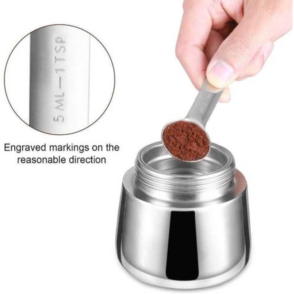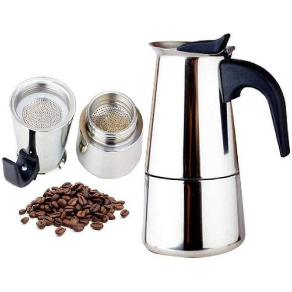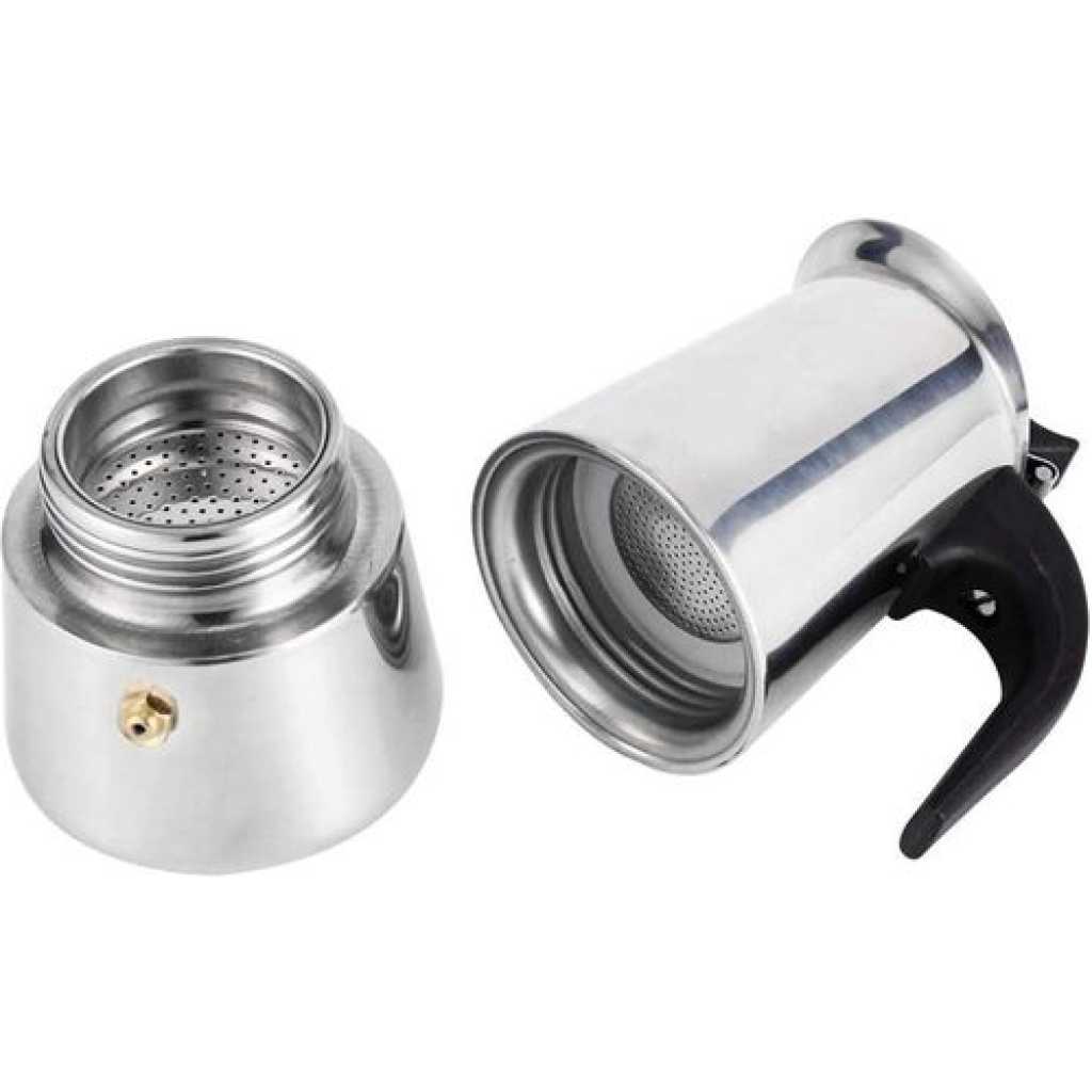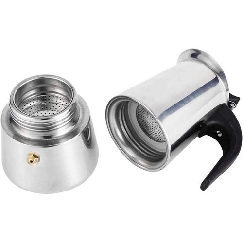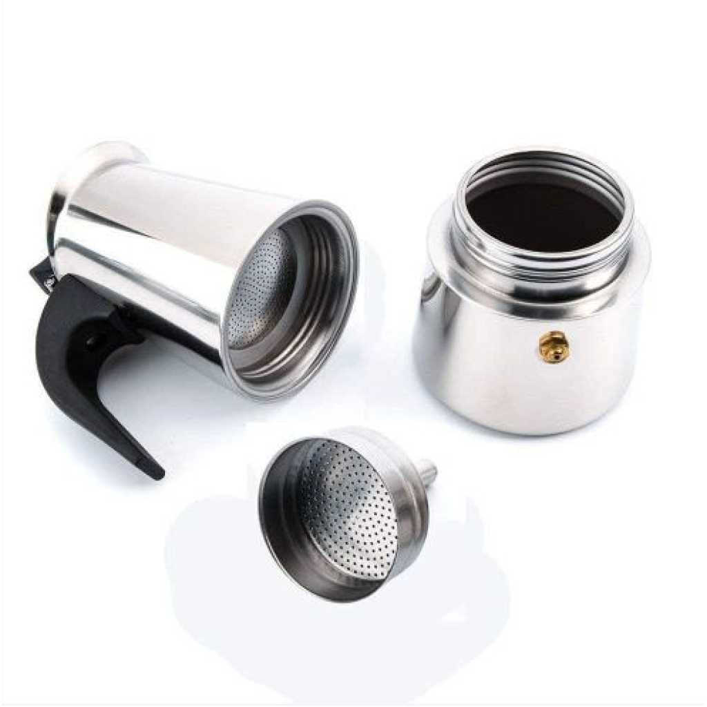 Key Features: 9 Cups Moka Pot Large Capacity Stainless Steel 304 Moka Pot Coffee Maker Stovetop Espresso Maker Coffee 450ML- Silver Coffee Pot Type: Moka Pots Material: Stainless Steel Gross weight(about):260g/320g/410g/550g Capacity:450 ml Satisfactory service: We are full of confidence in the quality of the goods. If you have any questions, just contact us and our professional customer service team will give you a satisfactory answer.
