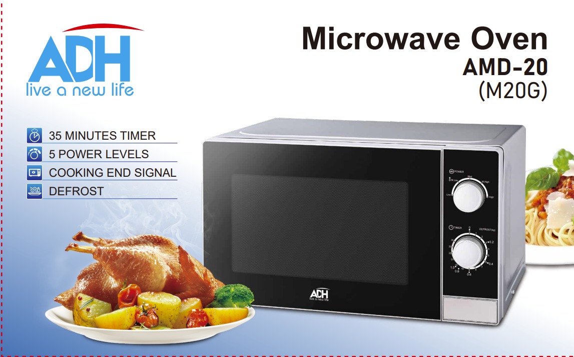 ADH 20L Microwave Oven AMD-20 M20G. 35 minutes timer Defrost function 5 power levels cooking end signal Control knobs Key Features: ADH 20L Microwave Oven AMD-20 M20G. 35 minutes timer Defrost function 5 power levels cooking end signal Control knobs