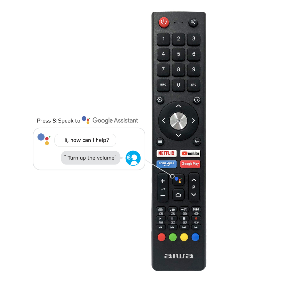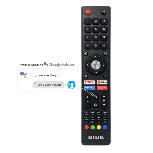 Key Features: Aiwa 43-Inch HD LED Android Smart TV, HDMI, USB, Netflix, Youtube, Prime Video, Inbuilt Free To Air Decoder – Black. Android TV with Quadcore processor Bluetooth remote with Google Assistant and voice commands Ultra-thin bezels Built-in Chromecast Shortcut media streaming buttons on remote control Download your favourite apps from Google Play PVR recording to USB* Connectivity: RJ45 input, 3x HDMI inputs (one with ARC), 2x USB inputs, mini composite (AV) input, optical audio output, headphone out