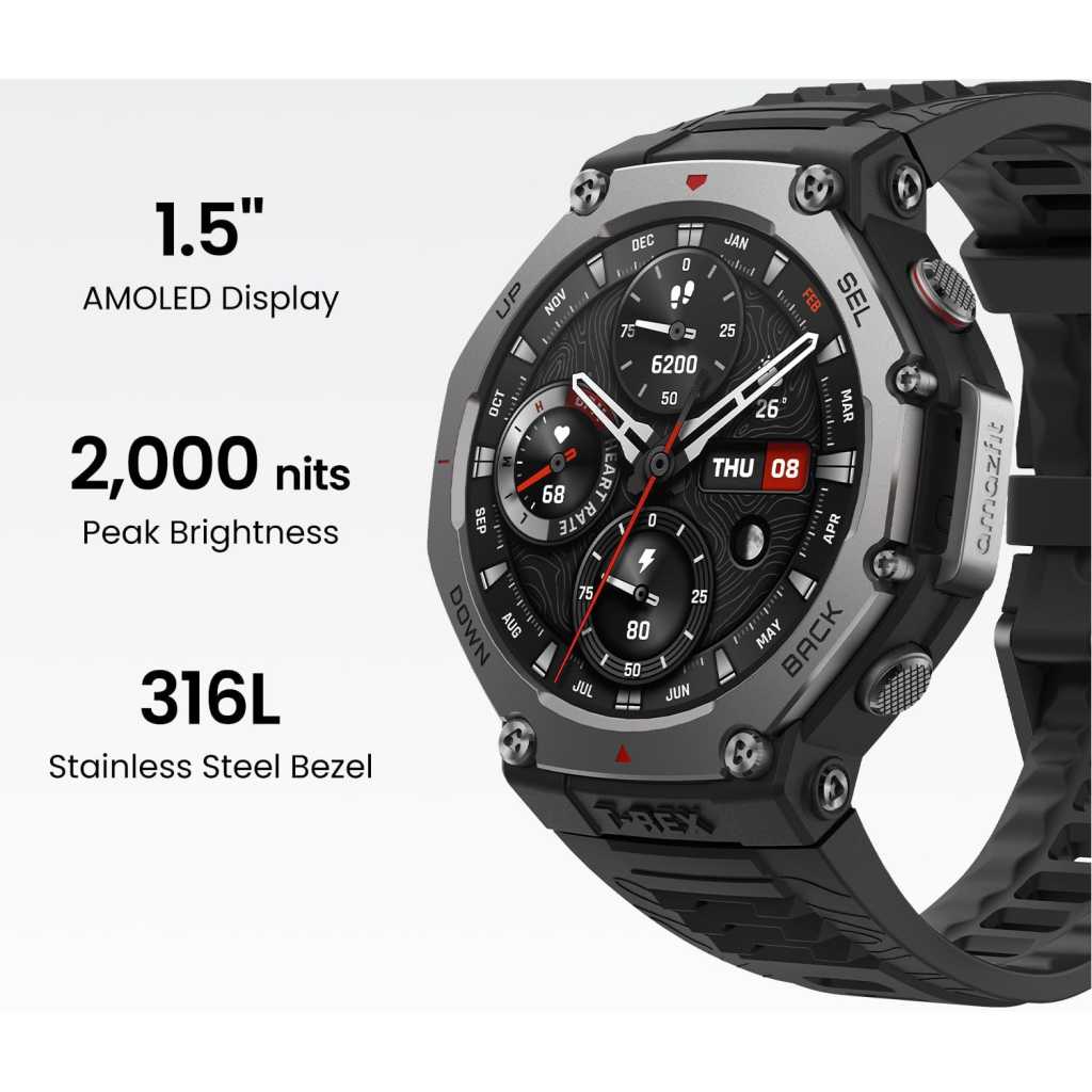 Key Features: ULTRA-BRIGHT AMOLED DISPLAY: With peak brightness of 2,000 nits, the Amazfit smart watch delivers easy reading of maps and workout data in any light. Night mode and Glove Mode enhance visibility for clear viewing DURABILITY FOR EXTREME CONDITIONS: This rugged smart watch, engineered with a 316L stainless steel bezel, withstands temperatures from -22°F to 158°F, and is water-resistant to 328 feet and can be used for freediving to a depth of 147 Feet EXTENDED BATTERY LIFE: The Amazfit T Rex 3 offers over 3 weeks of power with typical use or up to 180 hours in GPS mode, providing long-lasting performance for hiking trips or outdoor activities PRECISION NAVIGATION TOOLS: The smart watch for men and women provides free global maps with dual-band positioning. Six satellite systems offer fast, accurate GPS connections and precise turn-by-turn navigation EXPANSIVE FITNESS TRACKING: This fitness watch offers 170+ workout modes and AI-generated training plans, providing real-time updates to guide your fitness journey from hiking to surfing