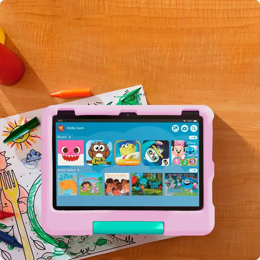 A fully featured tablet (not a toy) with a wide, 10.1″ 1080p Full HD display for kids ages 3-7 includes comprehensive parental controls, 1 year of Amazon Kids+, a kid-proof case, and a 2-year worry-free guarantee.