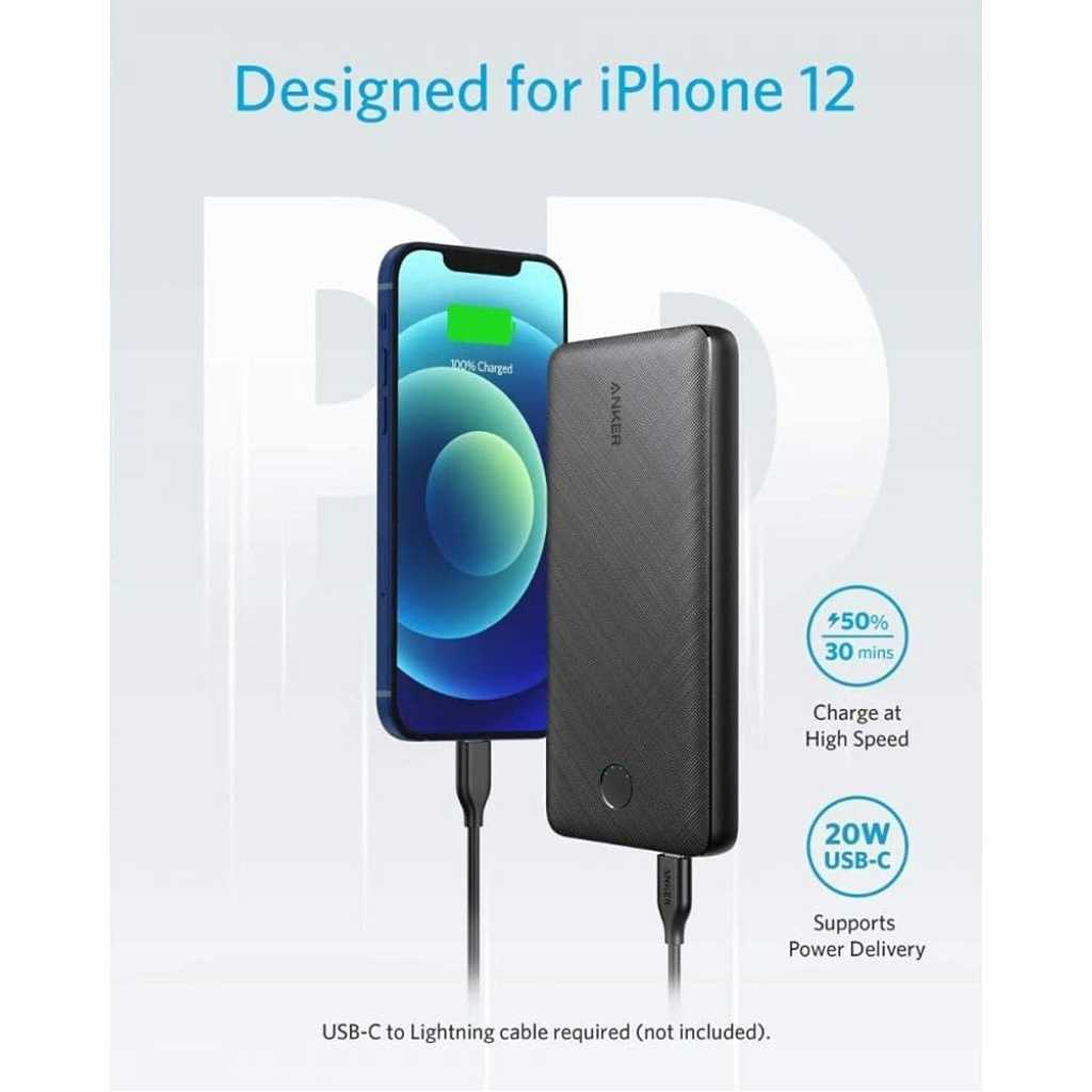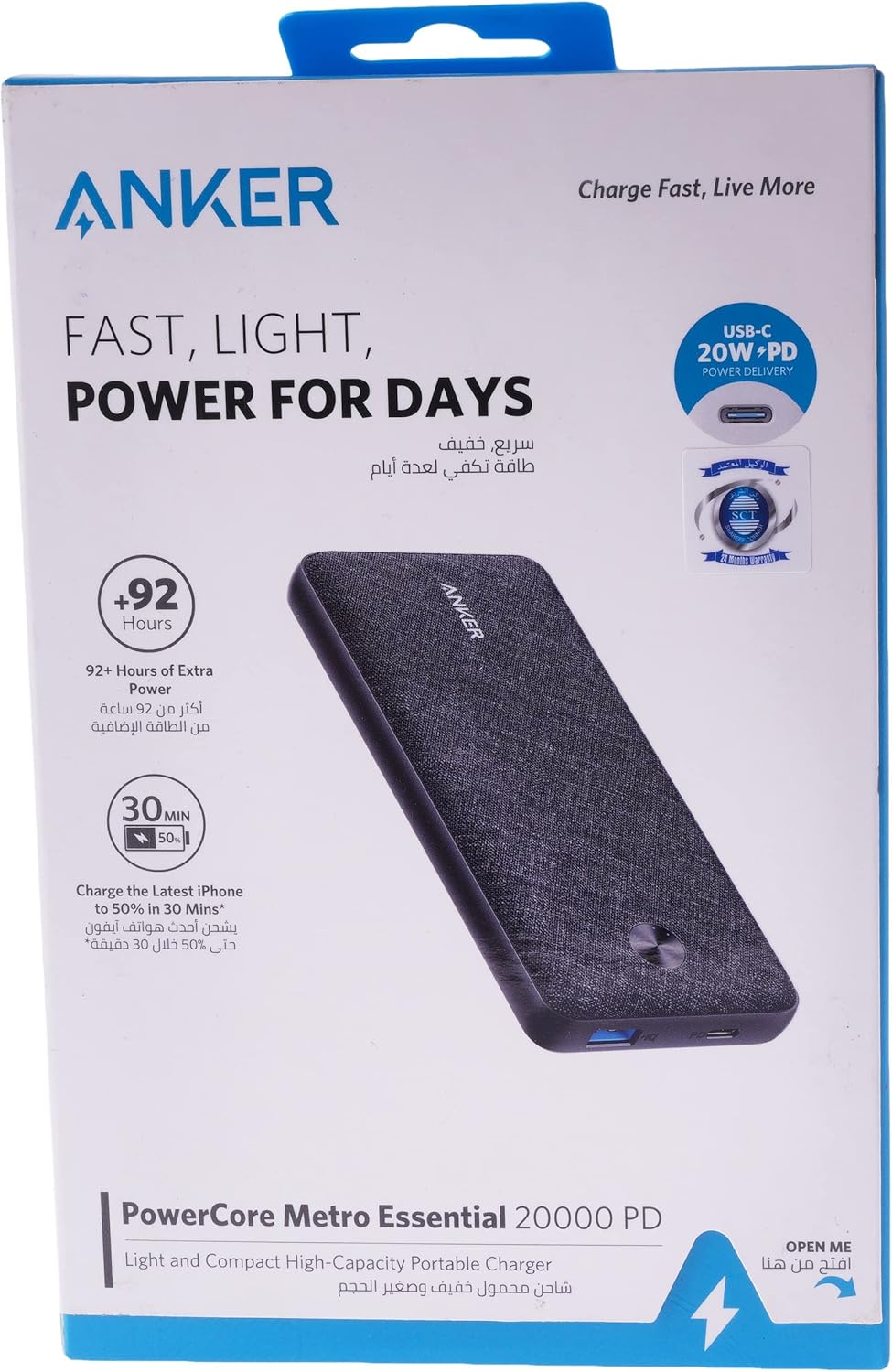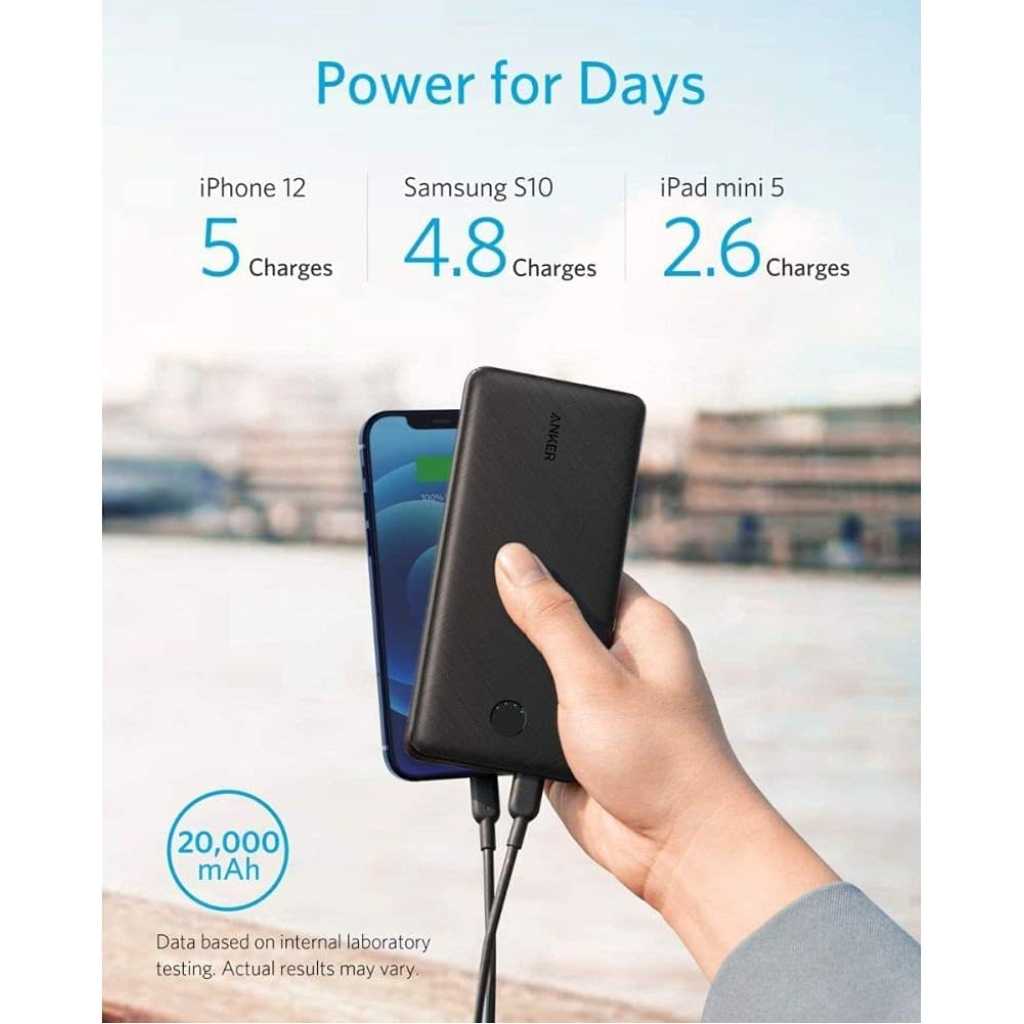 Key Features: The Anker Advantage: Join the 55 million+ powered by our leading technology. Charge Fast Anywhere: The 20W USB-C port has enough power to charge an iPhone 12 to 50% in just 30 minutes. Also equipped with an 18W USB port if you need to charge a second device. Ultra-High Cell Capacity: The massive 20,000mAh cell capacity provides 5 charges for iPhone 12, more than 4 full charges for Samsung Galaxy S10, and over 2 and a half charges for iPad mini 5. Wide Compatibility: Charge virtually any mobile device including phones, tablets, and more. What You Get: PowerCore Essential 20000 PD, USB-A to USB-C cable, USB-C to USB-C cable, travel pouch, welcome guide, and our worry-free 18-month warranty.