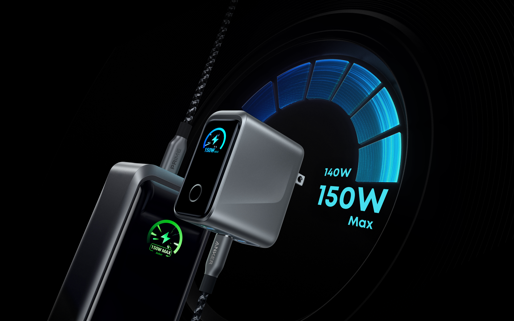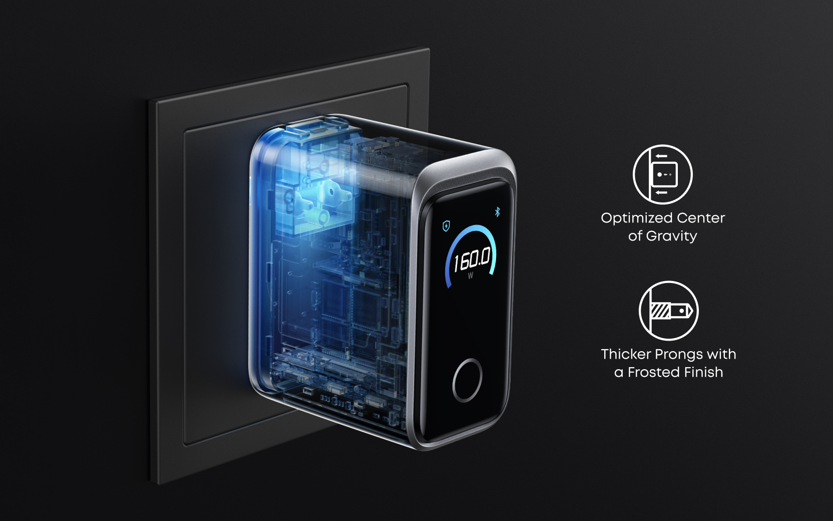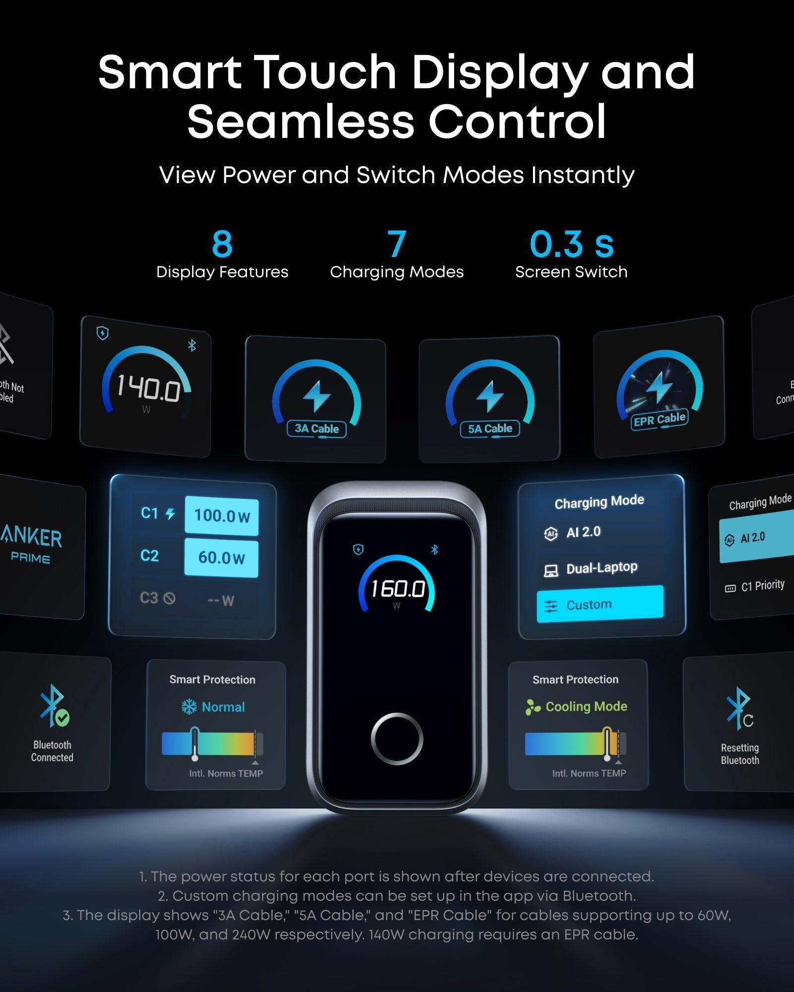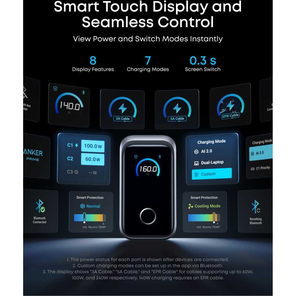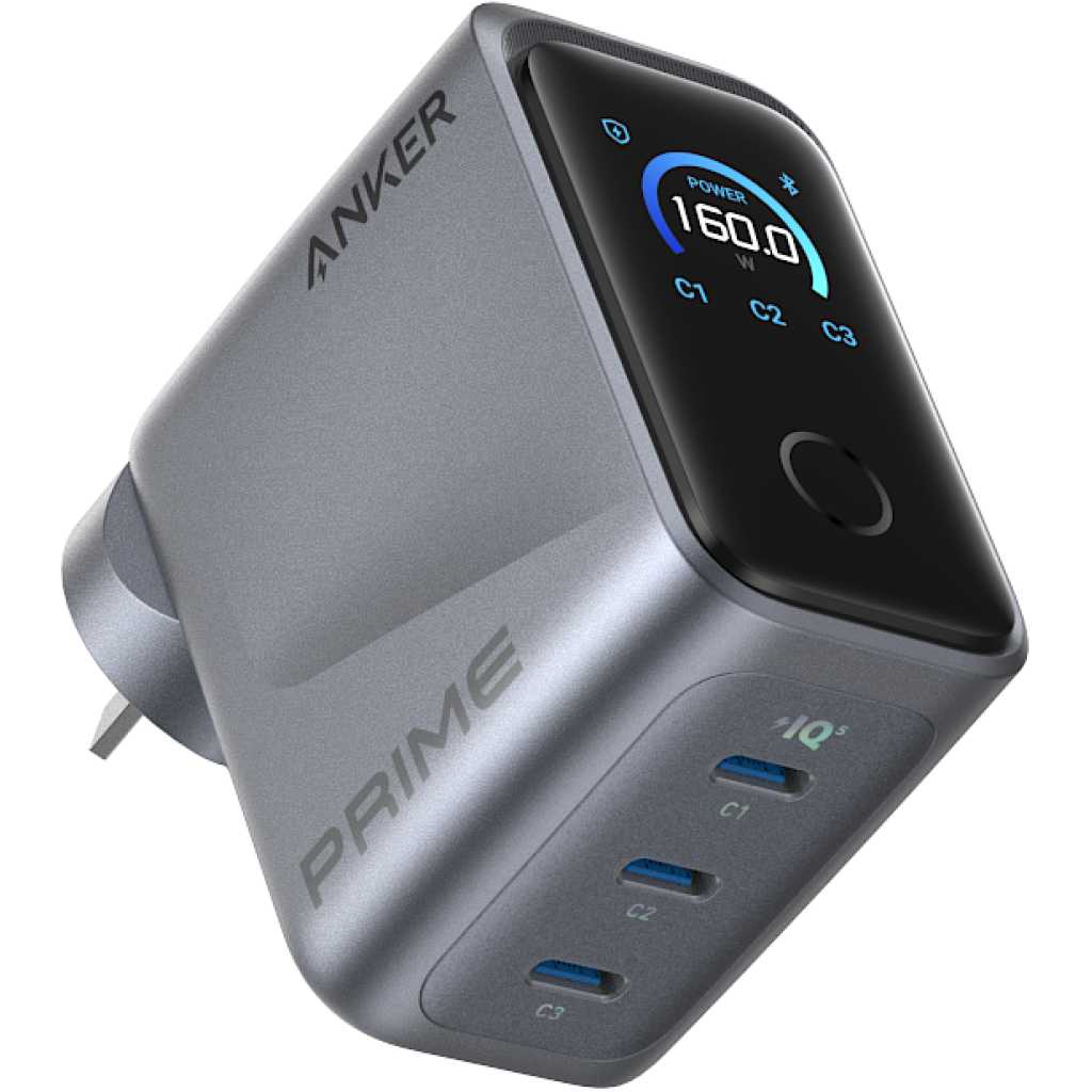 Anker Prime Charger, 160W 3-Port Compact USB C GaN Charger Block, Smart Display and Touch Control, 140W Max Charging via Any Single Port, for MacBook, Laptop, iPhone 17/16/15 Series, iPad, and More