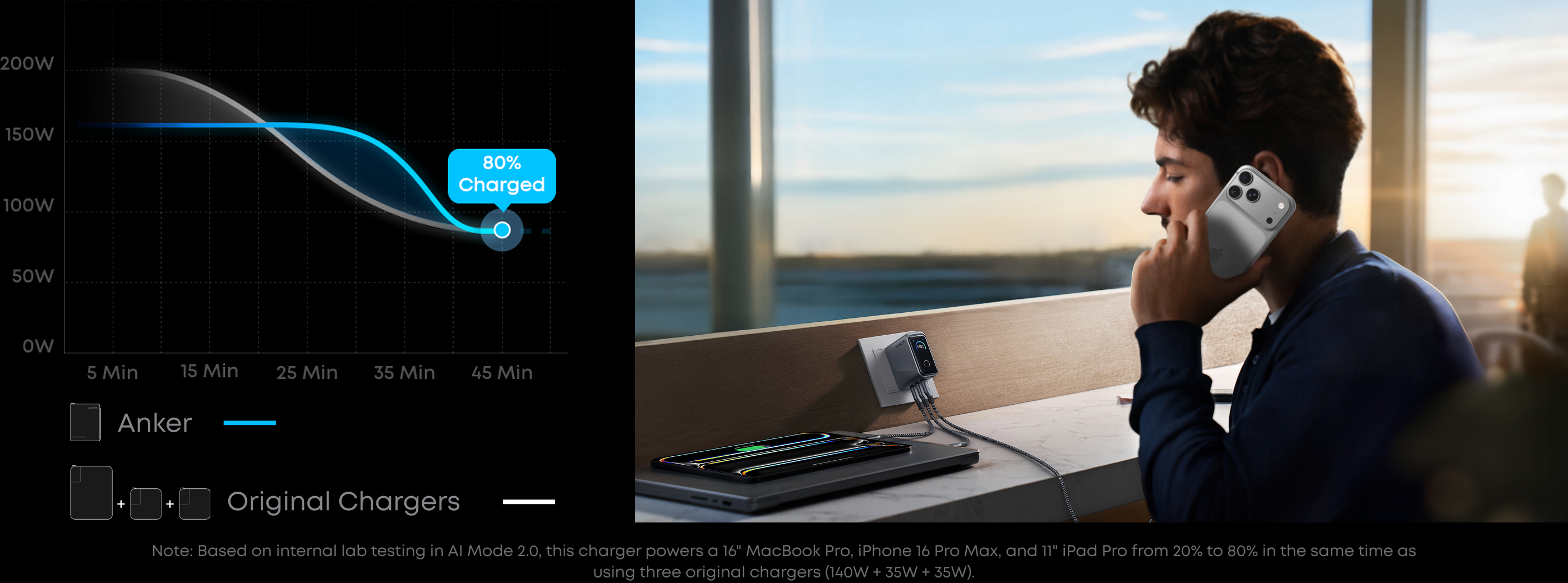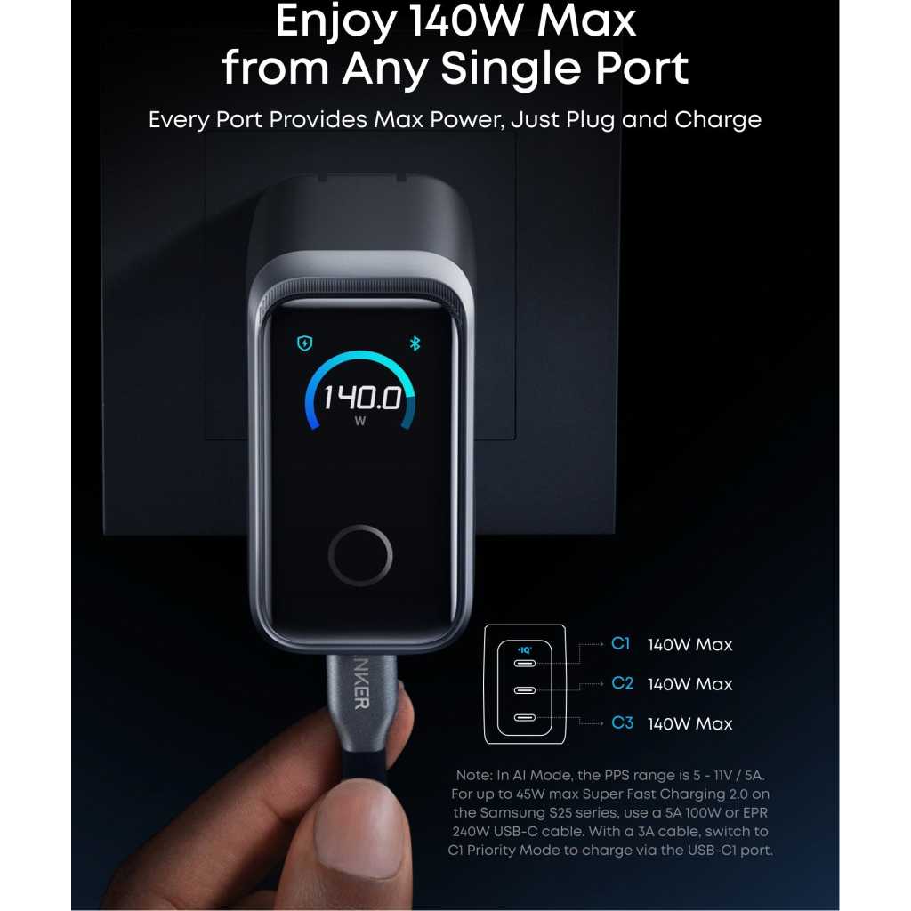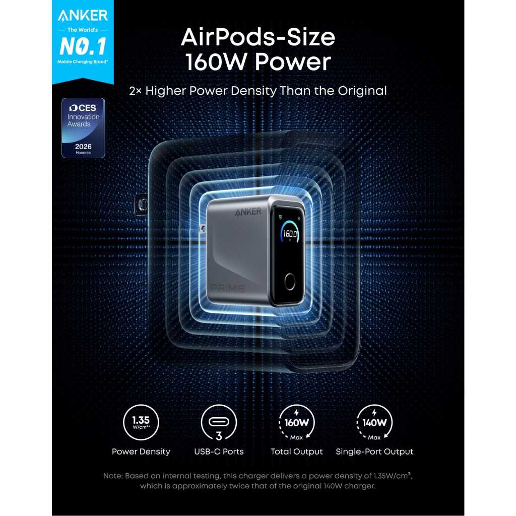 Key Features: AirPods-Size 160W Power: Delivering 1.35W/cm³ of power density, this sleek 3-port USB-C charger provides a total output of 160W while being as compact as an AirPods Pro 3 case, making it easy to carry yet powerful enough to handle your devices. 140W Single-Port Output: Enjoy a consistent 140W single-port output without derating, keeping laptops charging at maximum speed even during long work sessions or heavy loads. Charge a 16-inch MacBook Pro from 0 to 50% in just 25 minutes, without worrying which port to use. One Equals Three: With smart power distribution powered by PowerIQ 5.0, power a 16″ MacBook Pro, iPhone 16 Pro Max, and 11″ iPad Pro in the same time as three original chargers (140W + 35W + 35W). Carry one instead of three and stay fully productive on the go. Smarter Charging Control: With AnkerSense View, monitor power in real time on screen, switch modes instantly, and unlock custom modes through the app via Bluetooth. What You Get: Anker Prime Charger (160W, 3 Ports, Smart Display), welcome guide, 24-month warranty, and our friendly customer service.