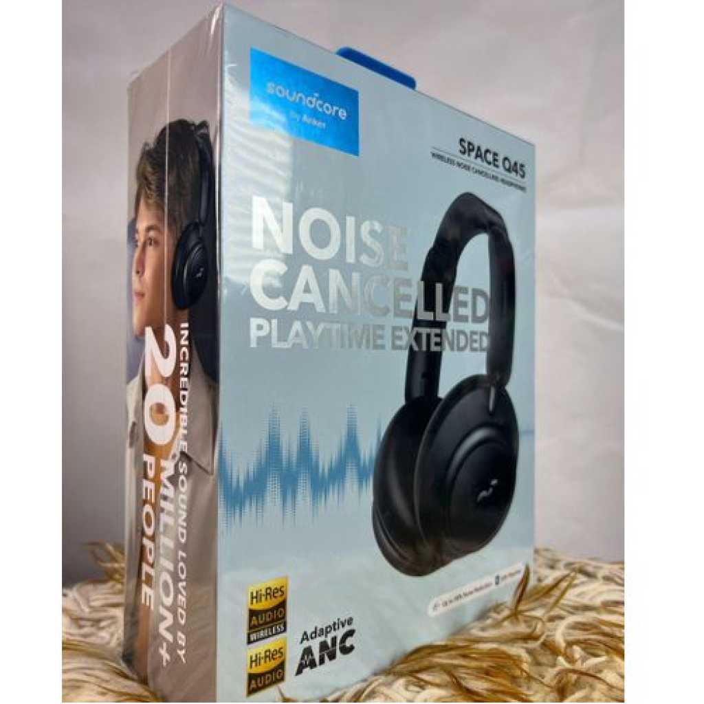 Enjoy Personal Space Anywhere: Low, mid, and high frequency noises are individually targeted by the 3-stage noise cancelling system. Hybrid active noise cancelling reduces low-frequency sounds like airplane engines and traffic noise by up to 98%. The other 2 stages filter out mid and high frequency noises such as crying babies and barking dogs. Ideal for Long-Haul Flights and Traveling: Up to 50 hours of playtime in noise cancelling mode will easily cover a vacation, an around-the-world flight, or weeks of commutes. In normal mode, you’ll get up to 65 hours of listening, and if you run out of power mid-journey, a 5-minute fast charge gives you 4 hours of playtime. Tailored Noise Cancelling Response: Adaptive noise cancelling detects external noises around you and automatically adjusts to different tailored modes. It switches to maximum level on flights or trains, reduces wind noise when you’re outdoors, and switches to a lower, comfortable level indoors. Highly-Detailed Sound: Experience sound with new levels of detail thanks to Space Q45 Bluetooth headphones’ innovative double-layer diaphragm drivers. Bass is extended for extra punch, vocals are rich, and treble is crisp—allowing every layer of the song to shine through. Hi-Res Wireless Sound: LDAC mode transmits up to 3× more data than standard Bluetooth codecs for a stunning high-resolution experience, even when using Space Q45 Bluetooth headphones in wireless mode. Secure and Well-Fitting: Space Q45 noise cancelling headphones are packed with comfort-enhancing details. The aluminum alloy hinges flex to fit the shape of your head, and the cushioned headband has a seamless sliding design for easy extension. To fit ears of different sizes, the ear cups have a wider diameter, plus bouncy-soft cushioning for hours and hours of comfort. soundcore App: Choose from 22 EQ presets, select a suitable level of noise cancelling and transparency, set volume level limits, customize the controls, and more. Customized Transparency: Space Q45 noise cancelling headphones also has Talk mode, allowing you to speak to people in your vicinity with ease, while the 5 levels of transparency in the app allow you to choose how much of your surroundings you let in. Multipoint Connection: Connect Space Q45 noise cancelling headphones to 2 devices at the same time—ideal for when you want to switch between listening to music, attending remote meetings, and making calls. What’s in the box soundcore Space Q45 Headphone x1 USB-C Cable x1 AUX Cable x1 Protective Case x1